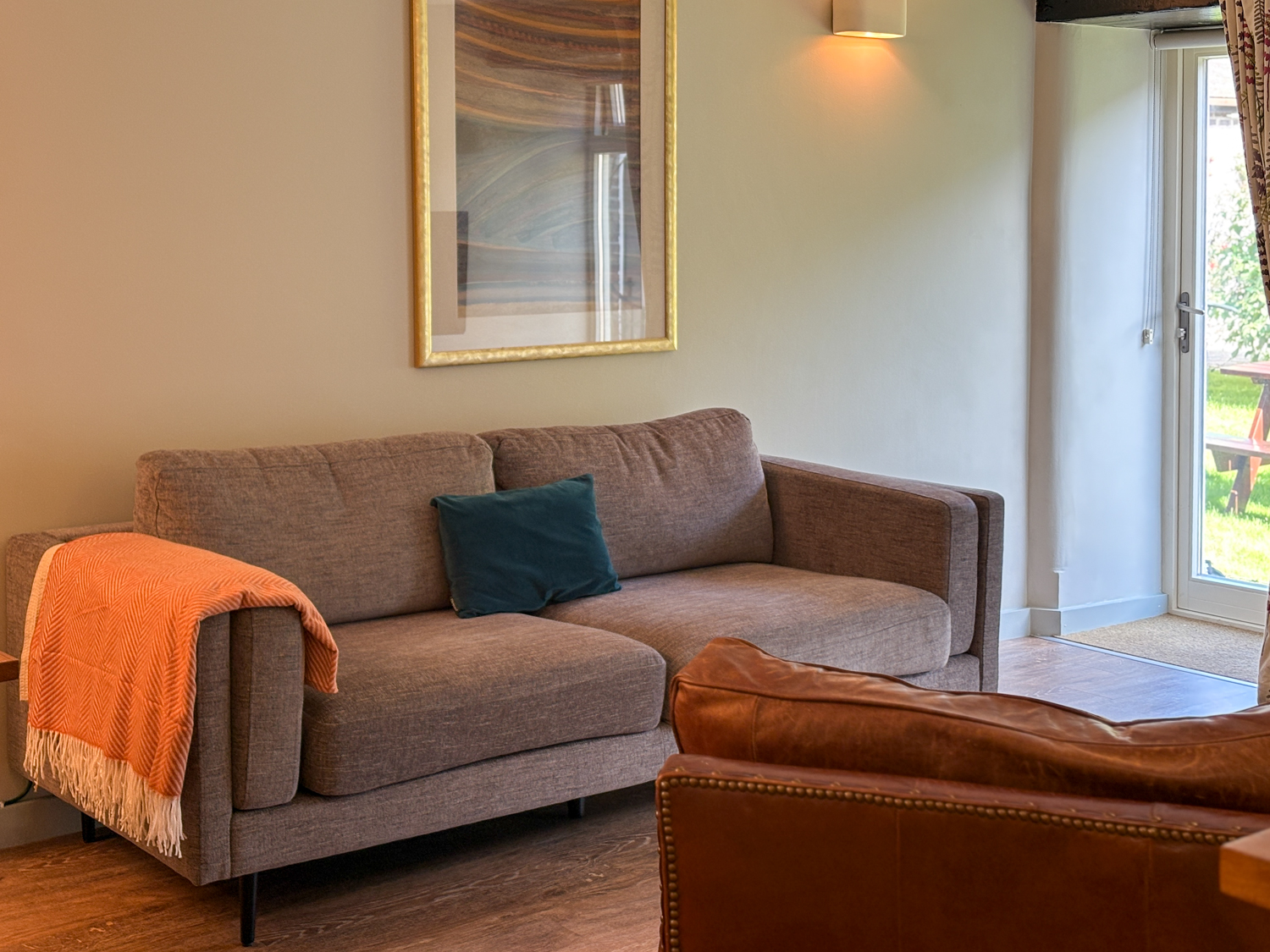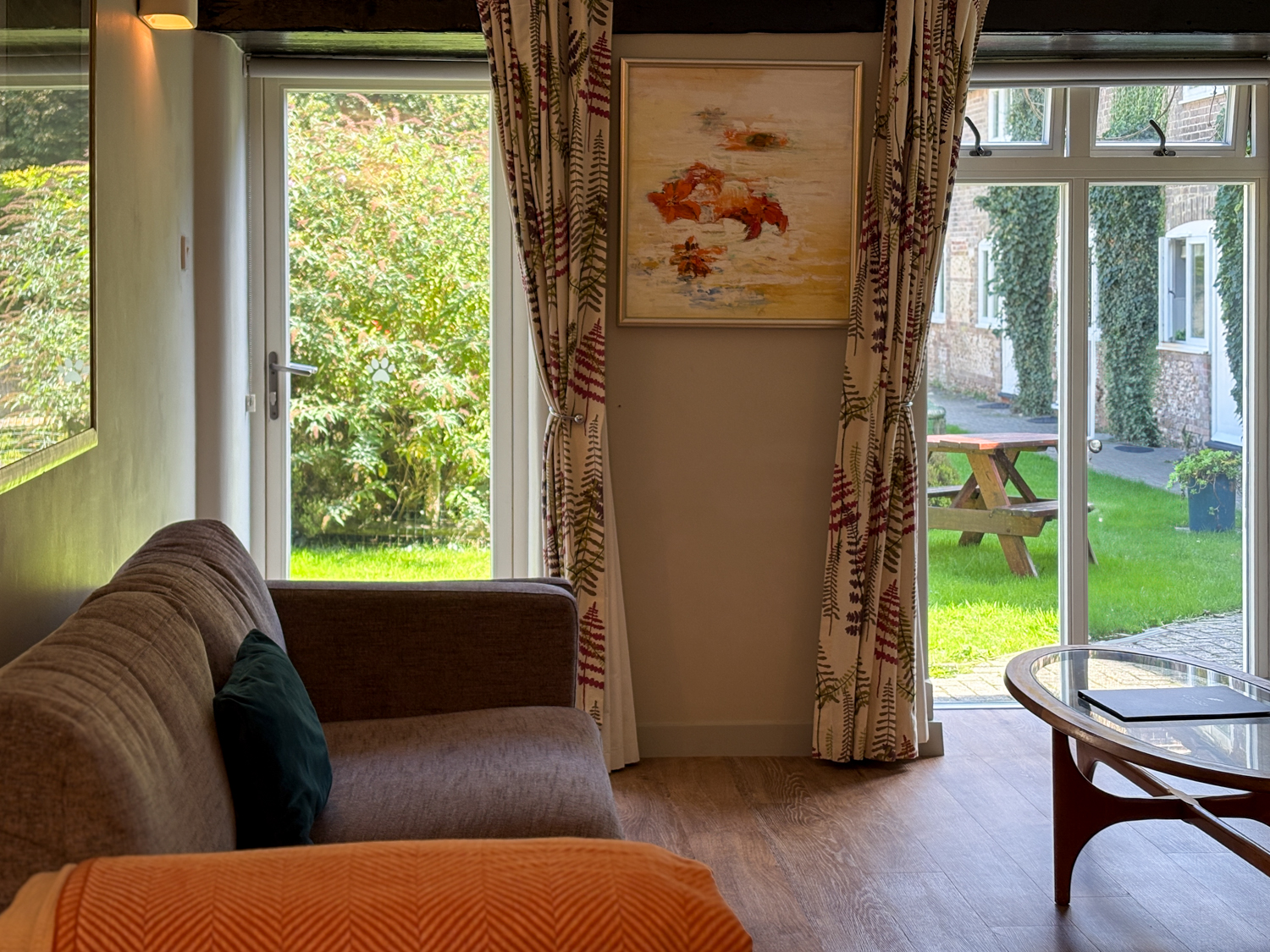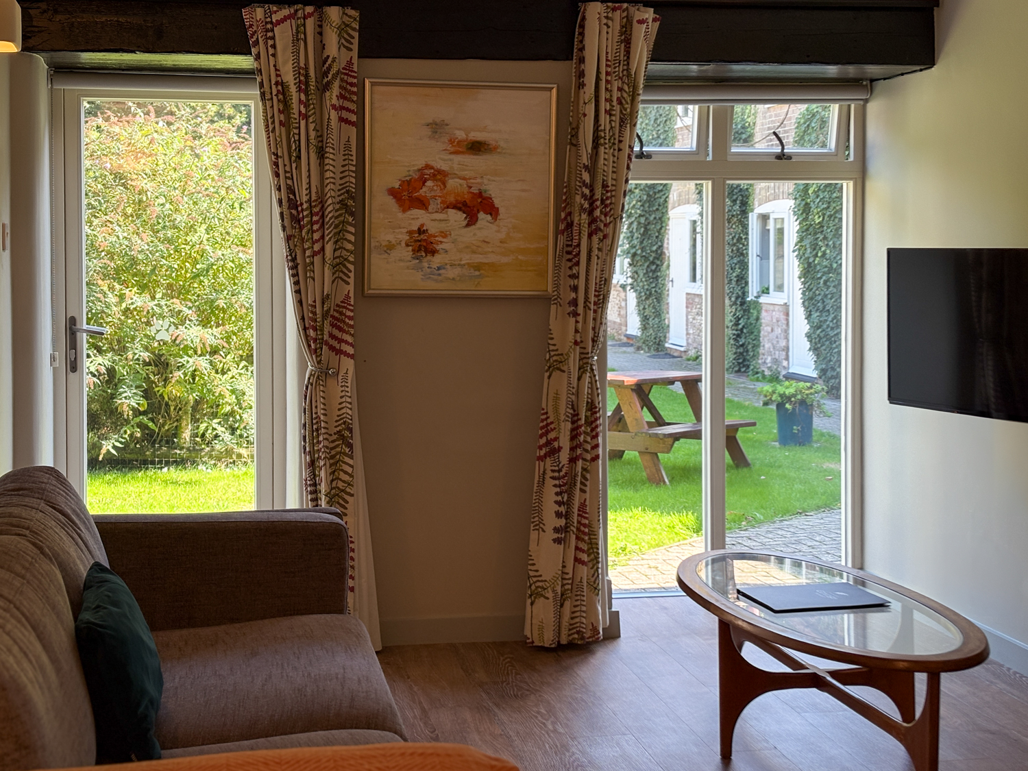 While the cottage overlooks the courtyard and has no private garden, guests enjoy full access to Greenwood Grange’s communal gardens, hot tubs, and outdoor leisure areas (See Estate Map).