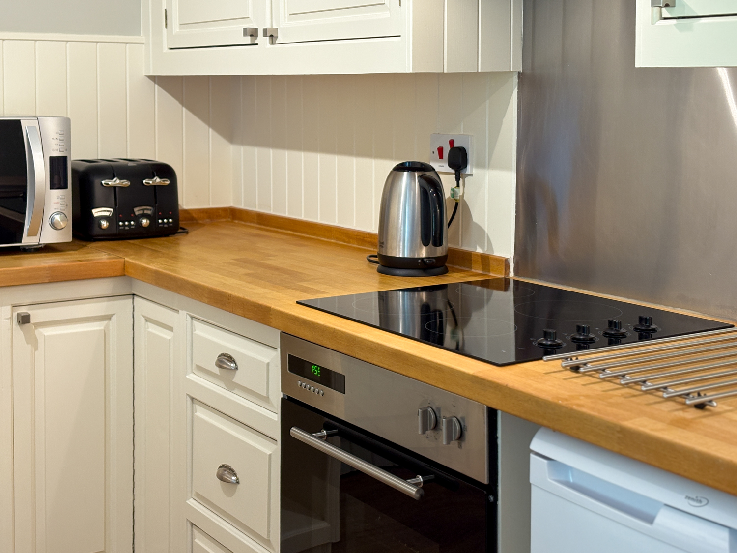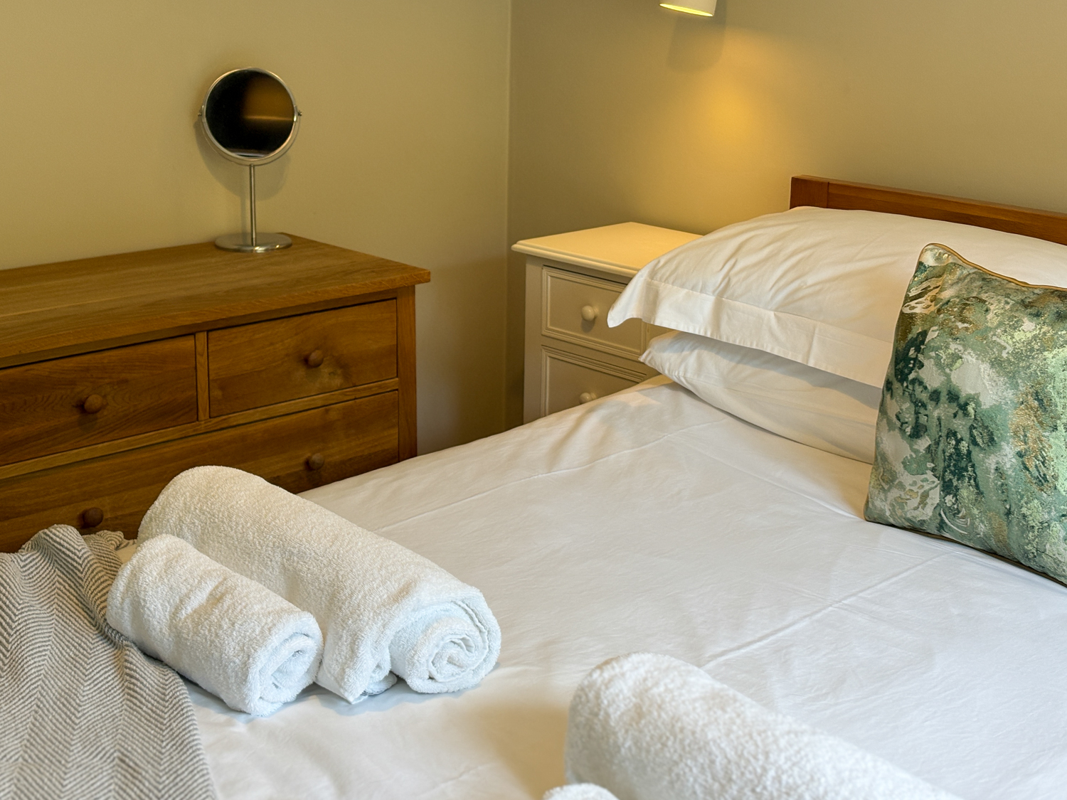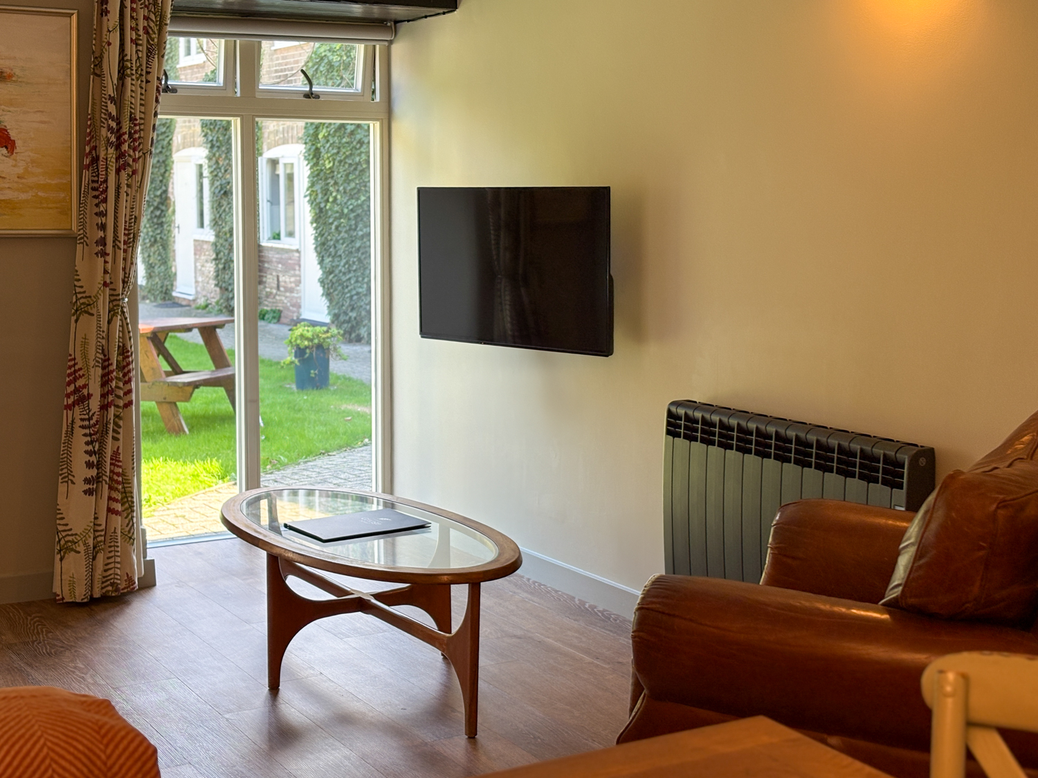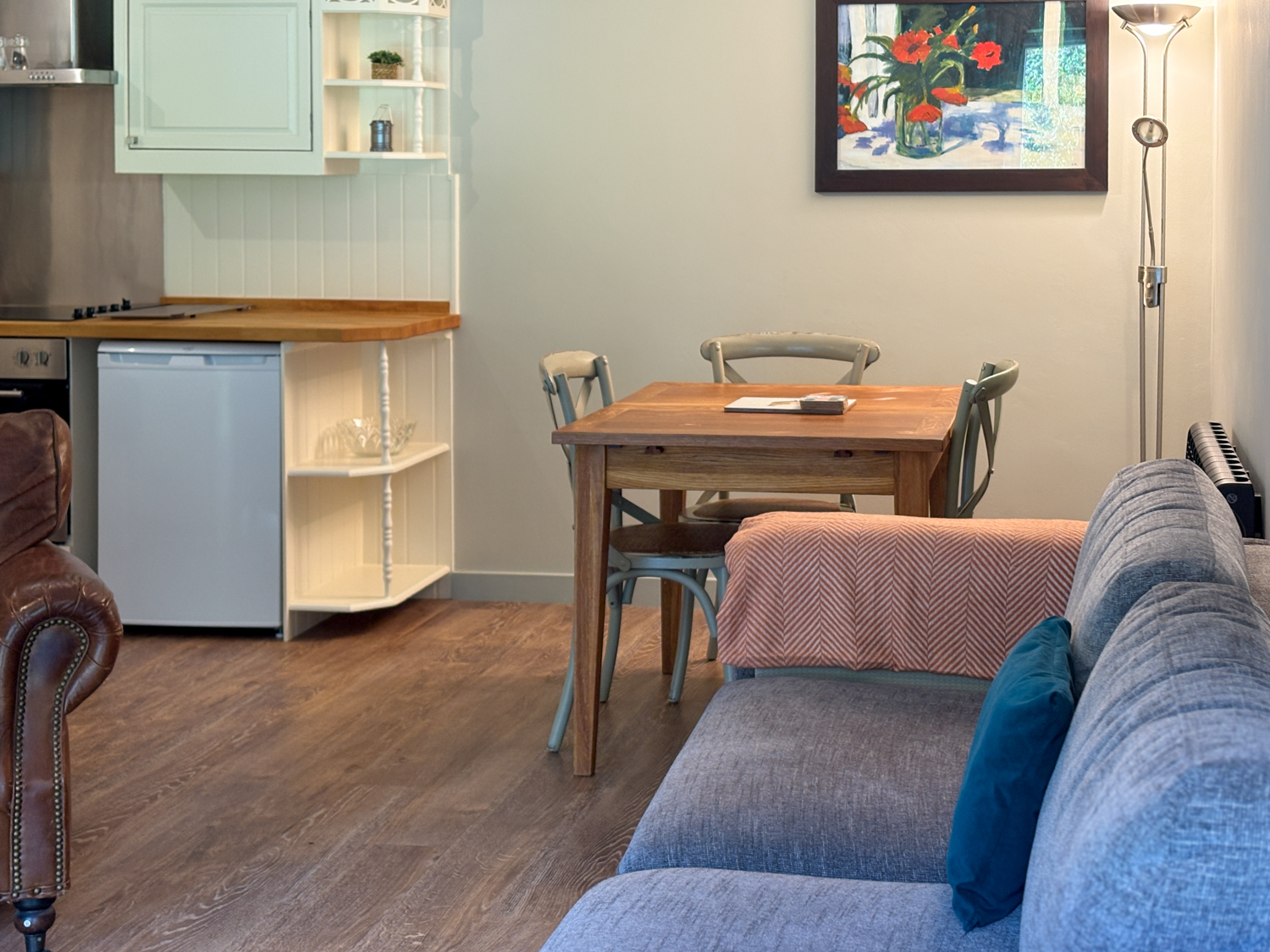 This ground-floor cottage combines modern style with classic charm. The open-plan L-shaped living area features large windows, hard floors, and a well-equipped self-catering kitchen. The dining space leads to a comfortable lounge with Smart TV, creating a cosy setting for relaxing evenings.