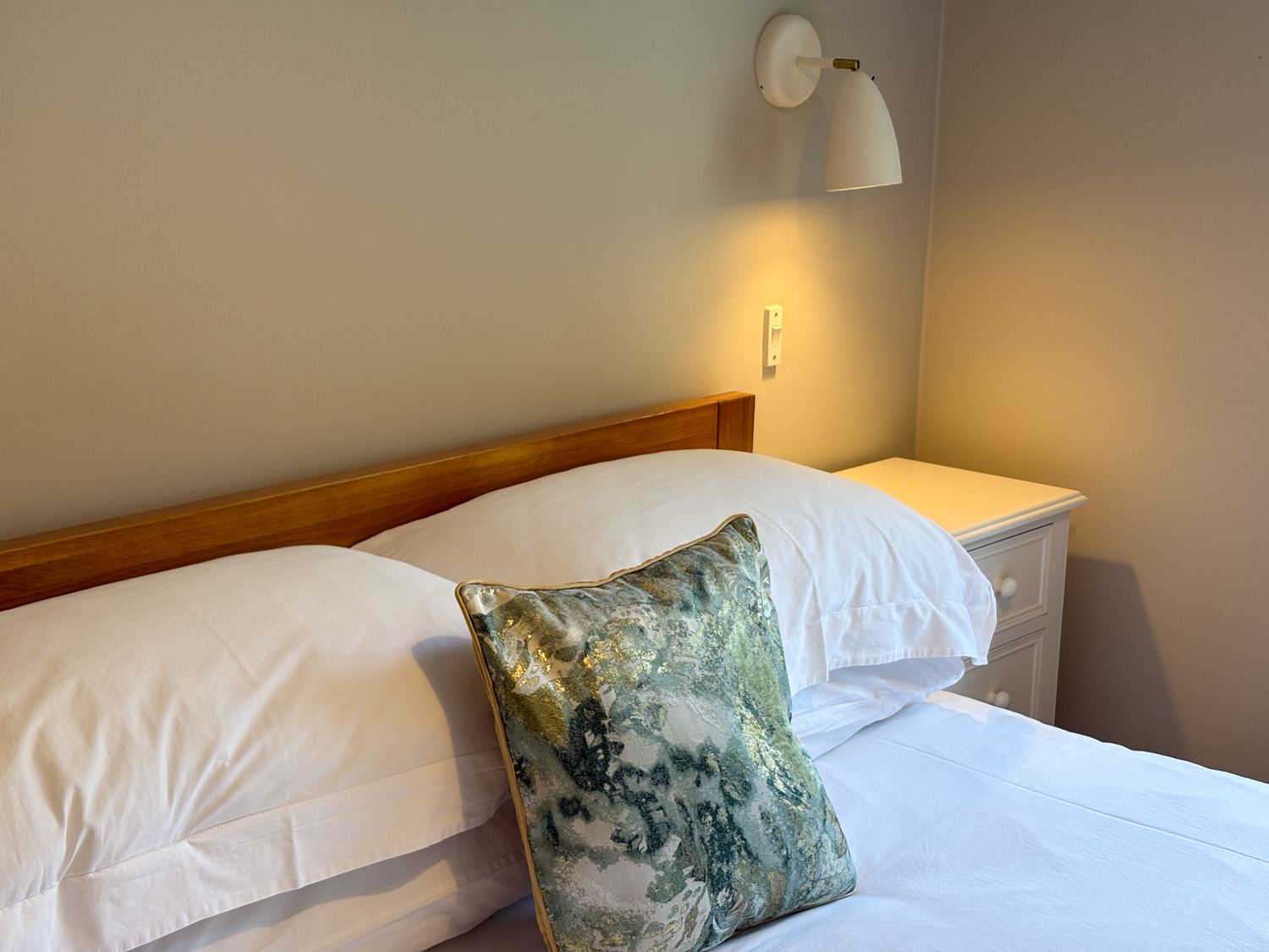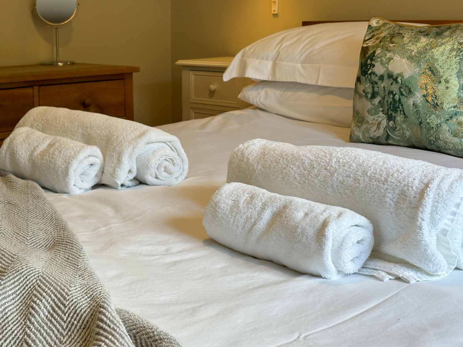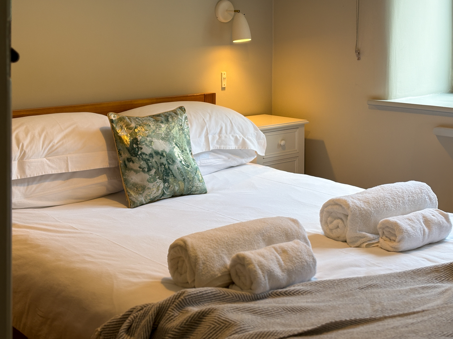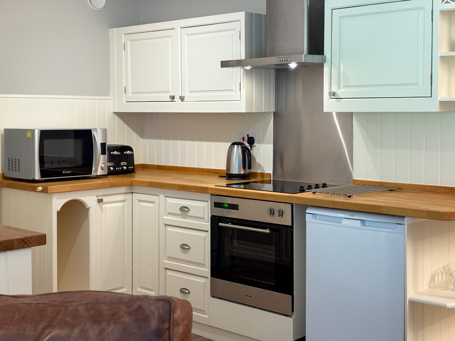 This ground-floor cottage combines modern style with classic charm. The open-plan L-shaped living area features large windows, hard floors, and a well-equipped self-catering kitchen. The dining space leads to a comfortable lounge with Smart TV, creating a cosy setting for relaxing evenings.