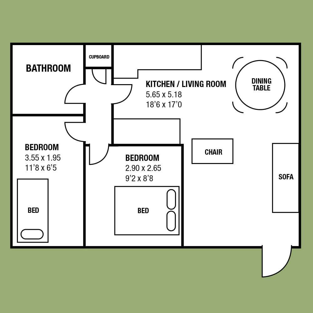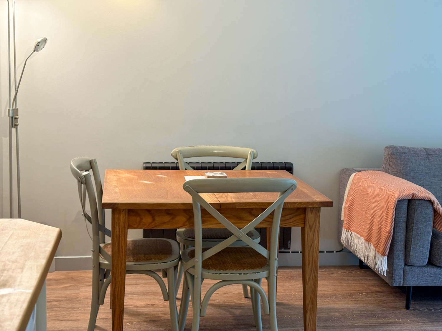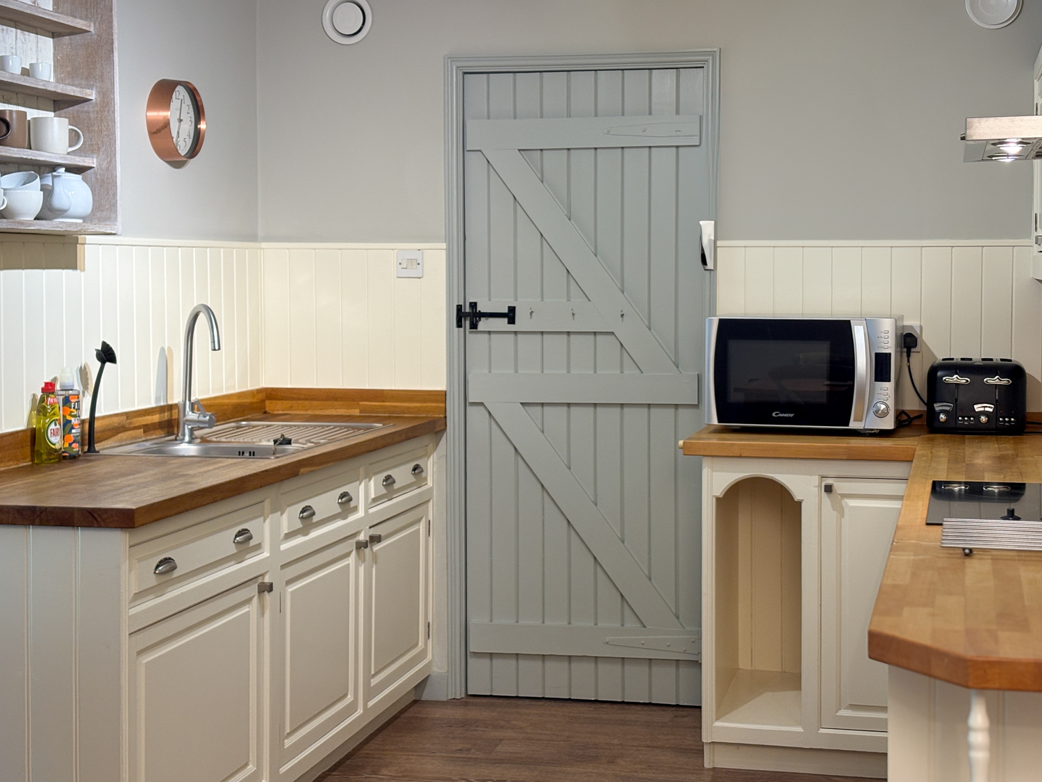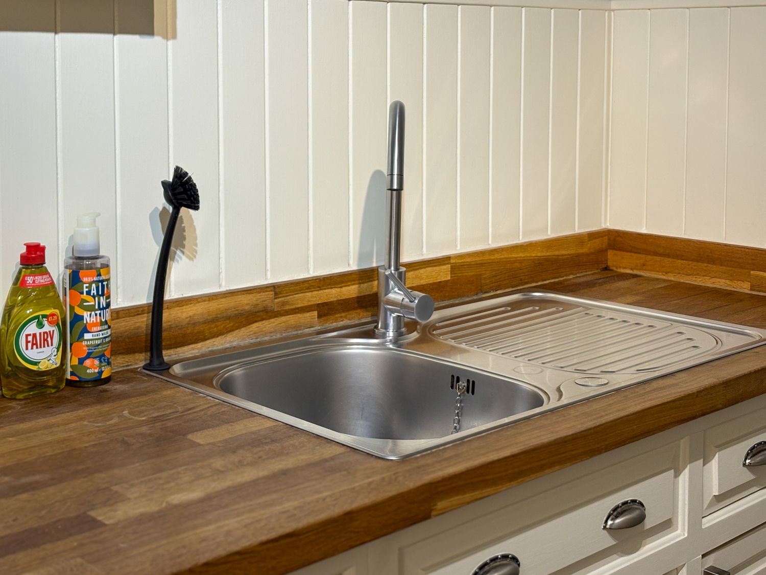 This ground-floor cottage combines modern style with classic charm. The open-plan L-shaped living area features large windows, hard floors, and a well-equipped self-catering kitchen. The dining space leads to a comfortable lounge with Smart TV, creating a cosy setting for relaxing evenings.
