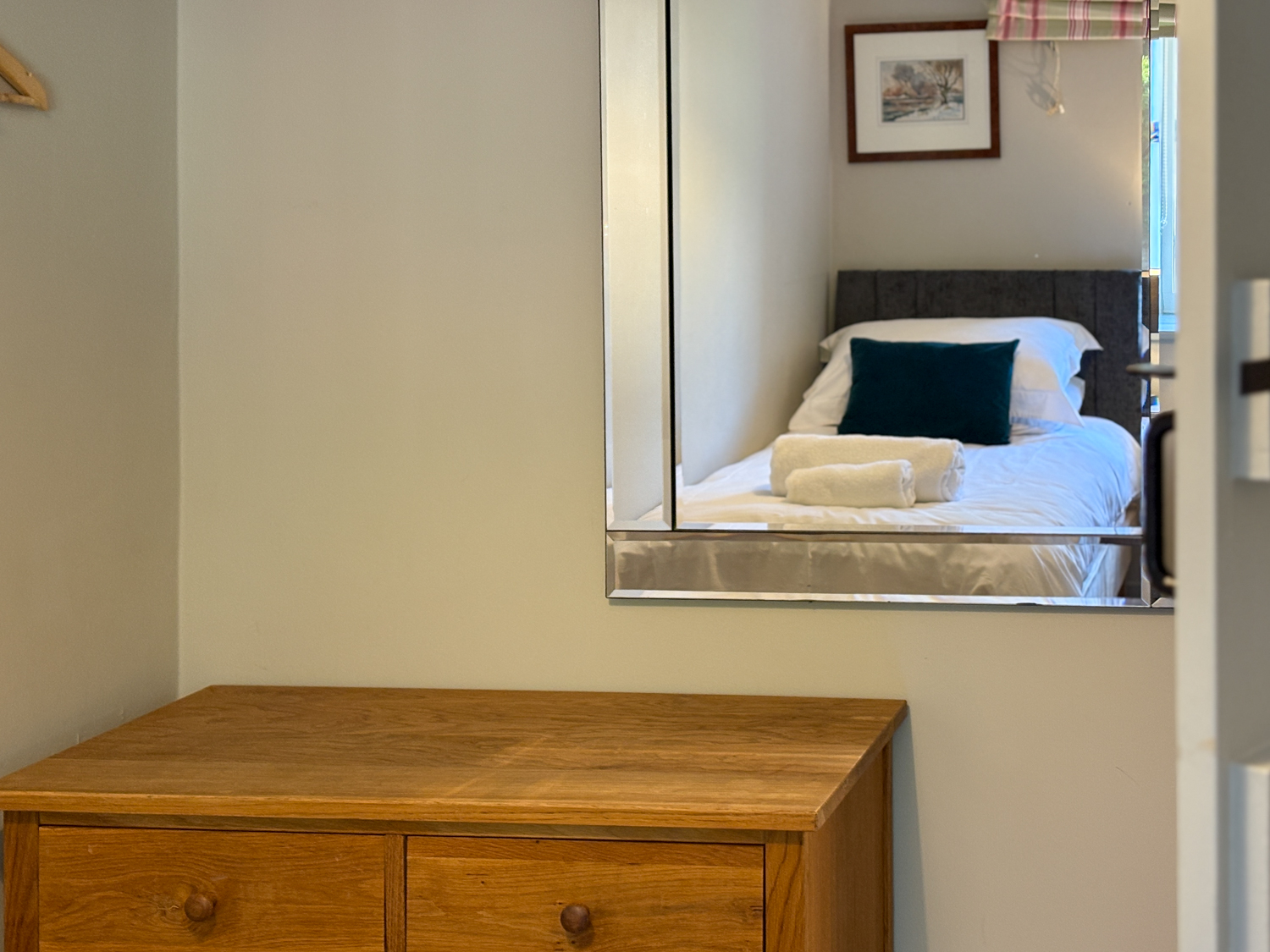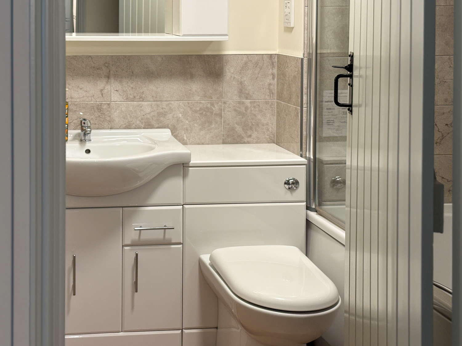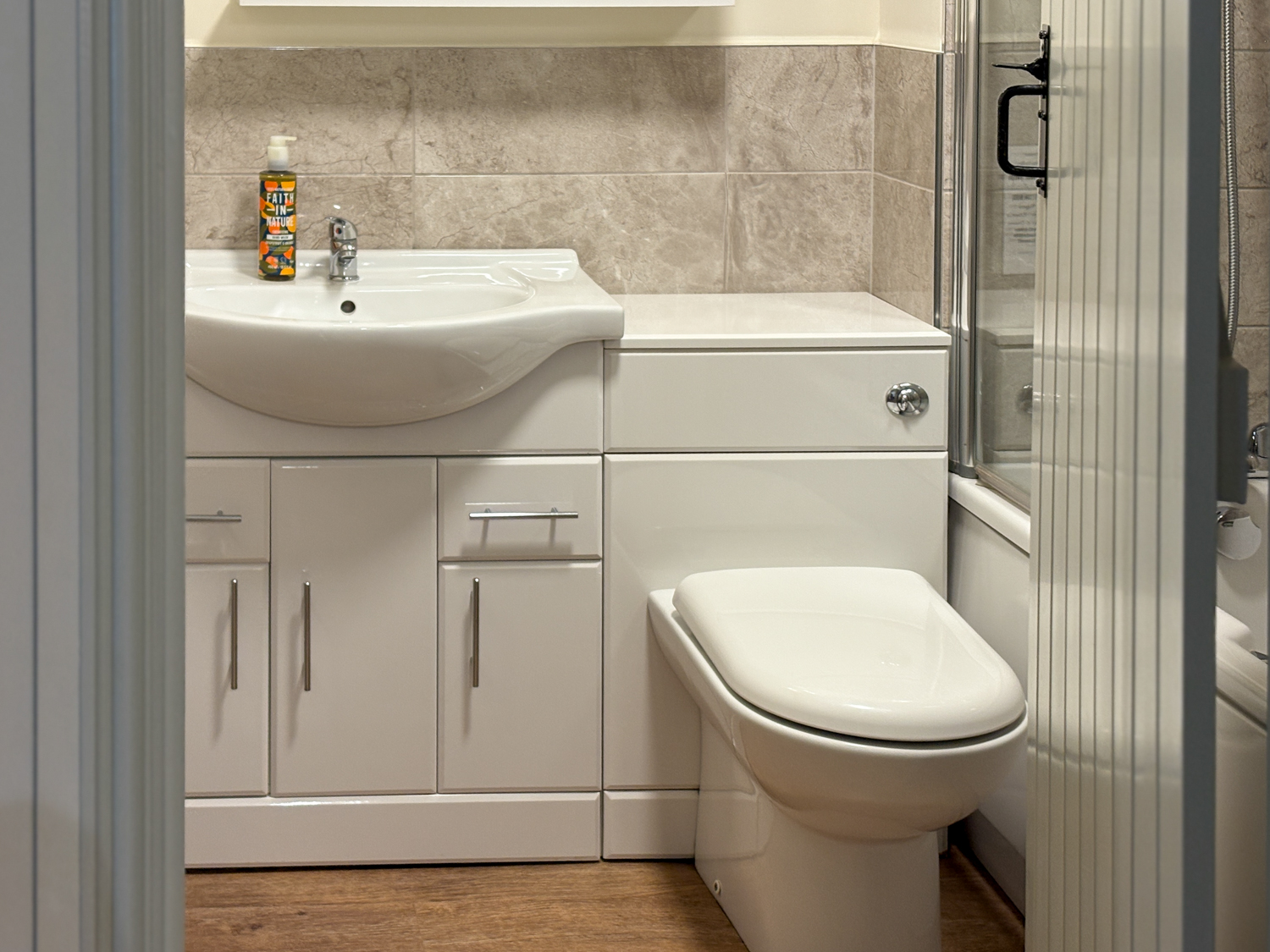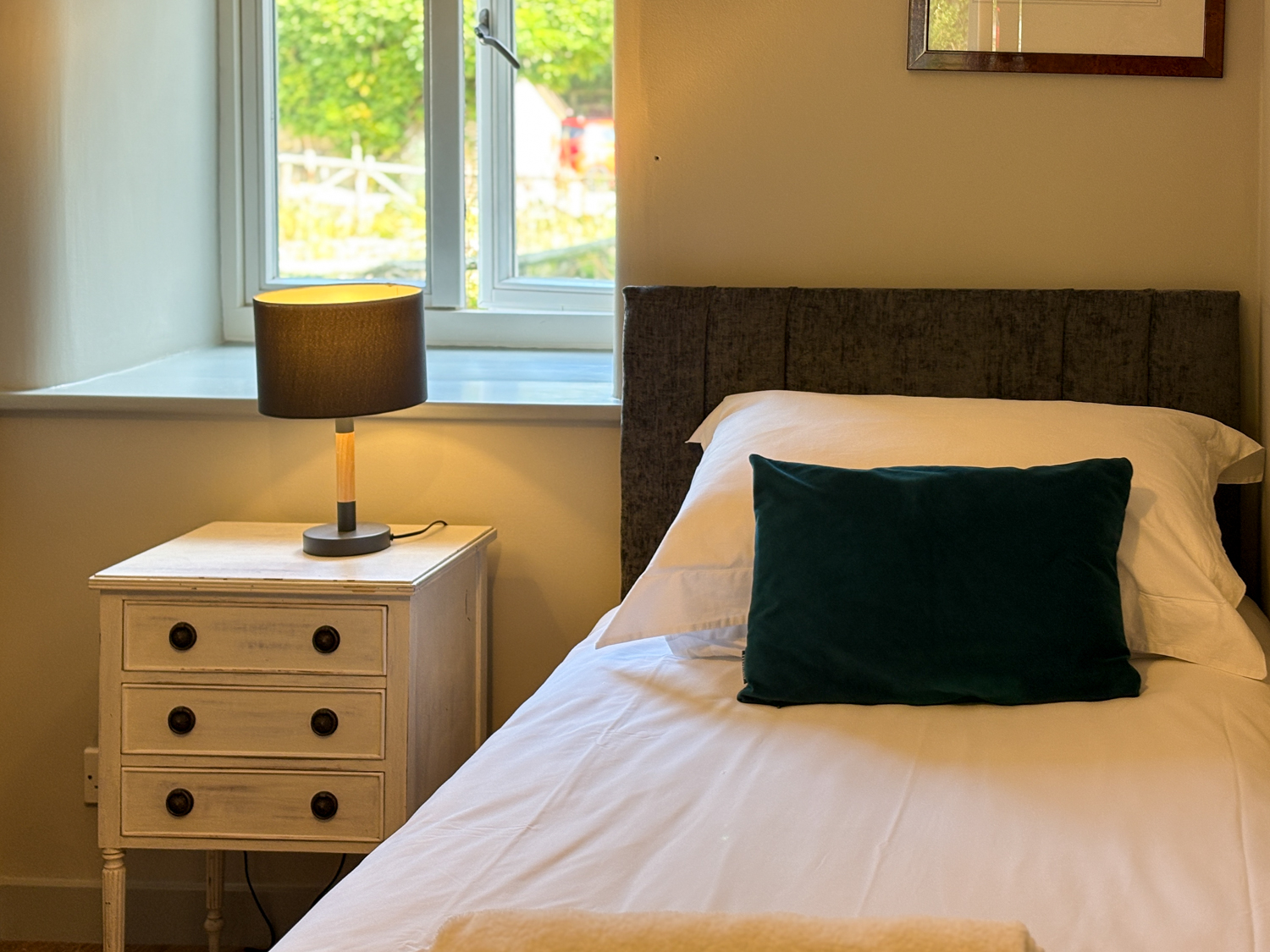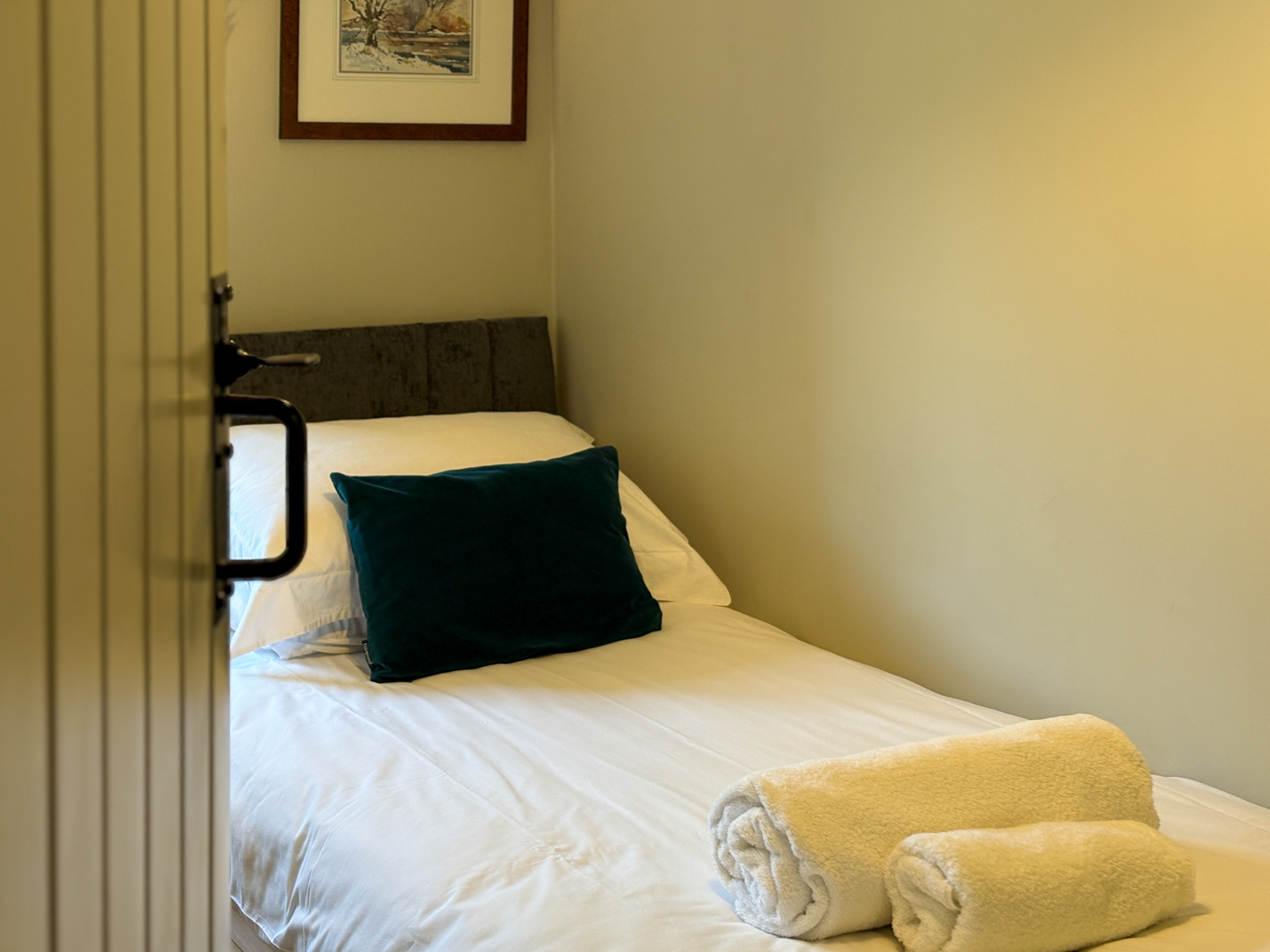 Sleeping three guests, Anglebury includes a double bedroom with courtyard views and a single bedroom (or space for a cot). The bathroom features a shower over the bath, basin, and WC with a modern finish.