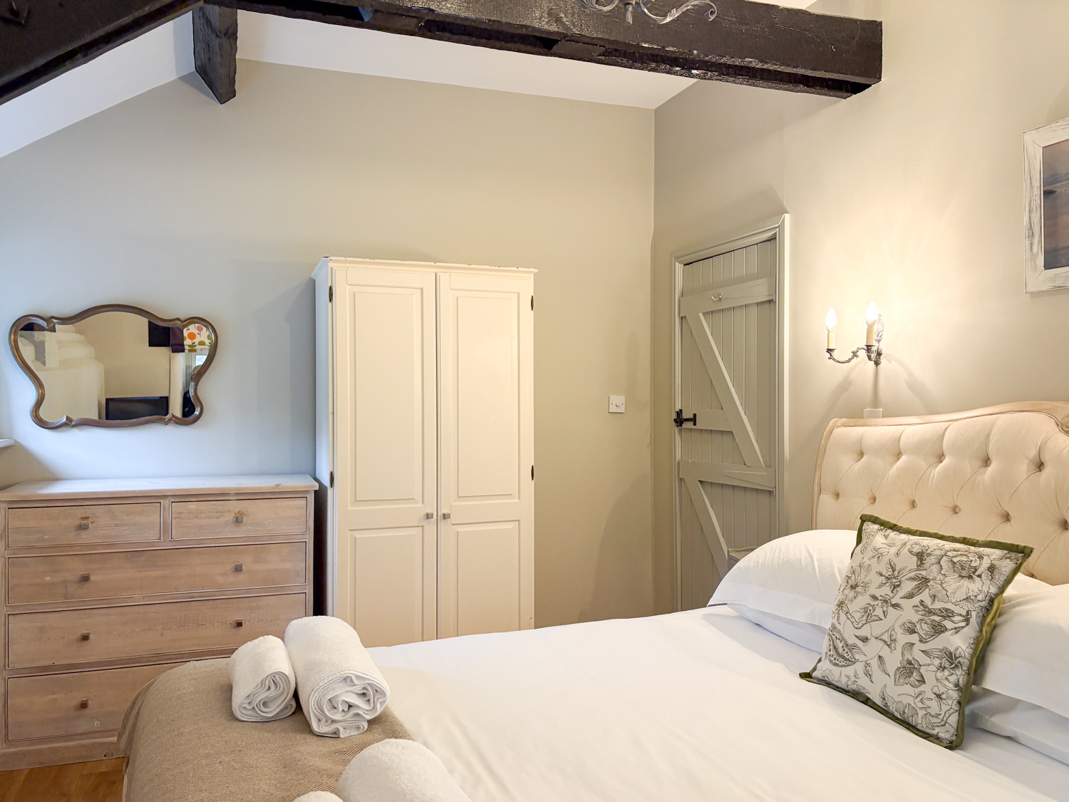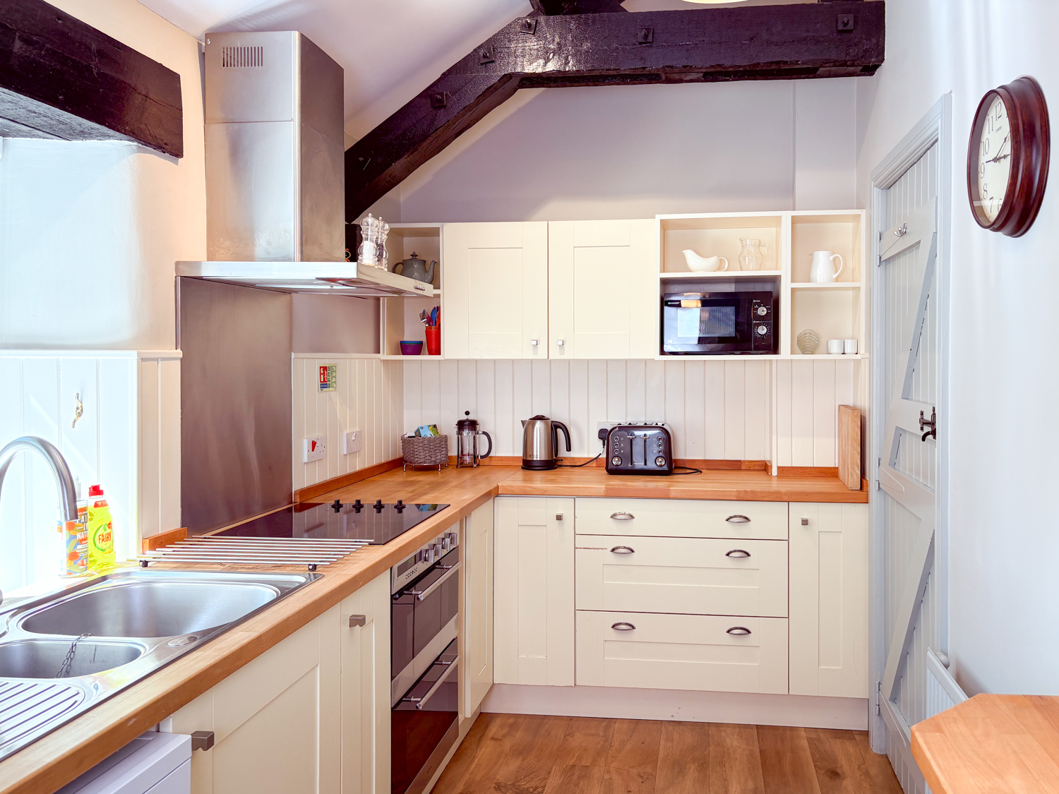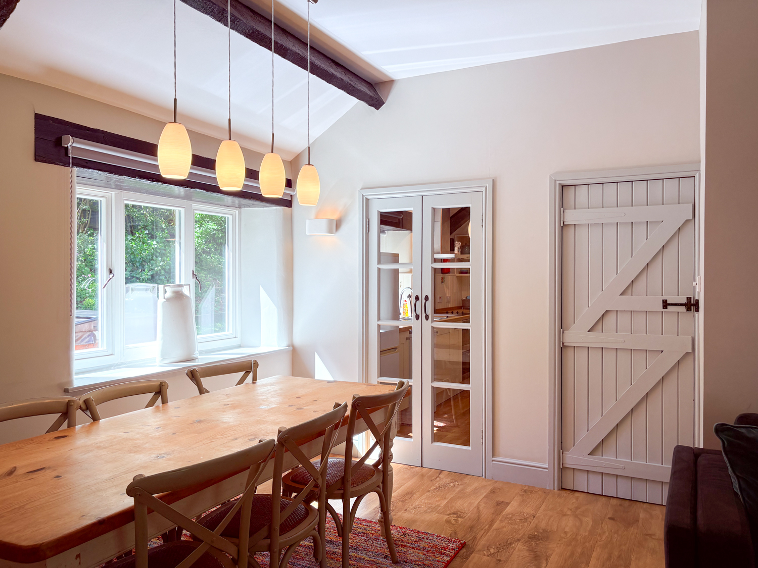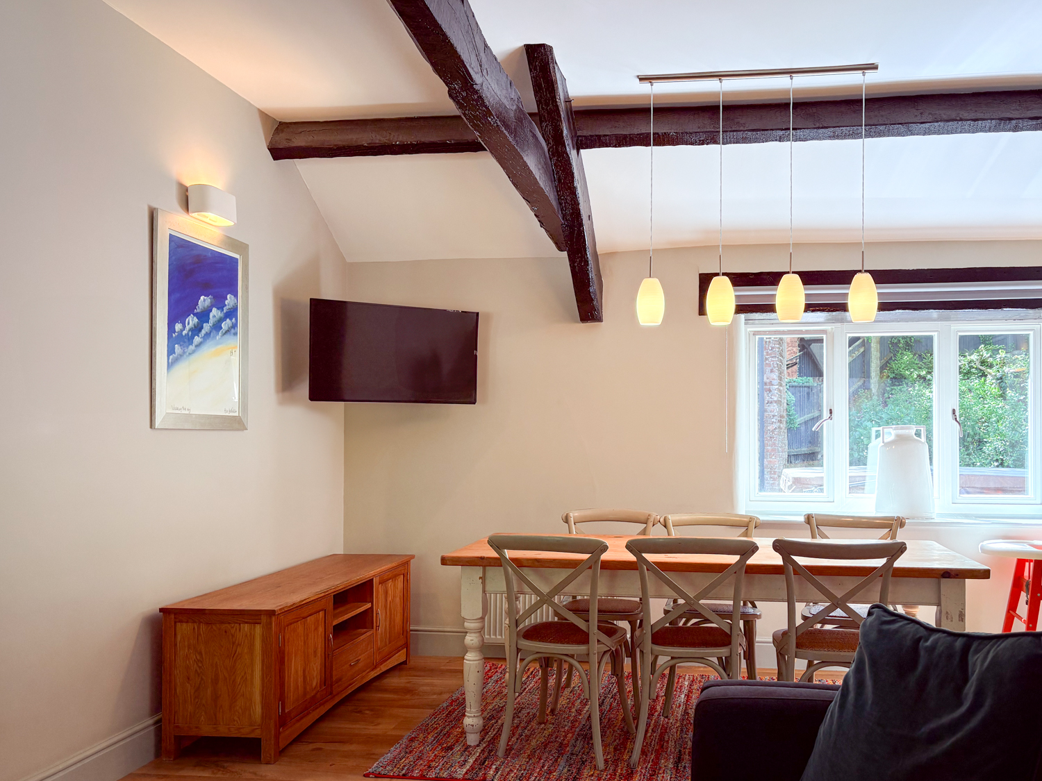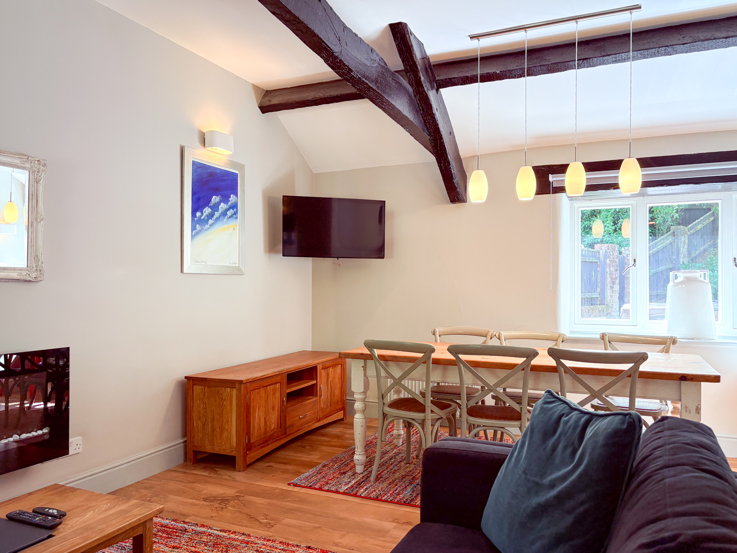 Blending contemporary furnishings and artwork with exposed beams and original brickwork, this single-storey property is full of character. The open-plan living and dining room comfortably seats six, featuring a Smart TV and large table for relaxed meals together.