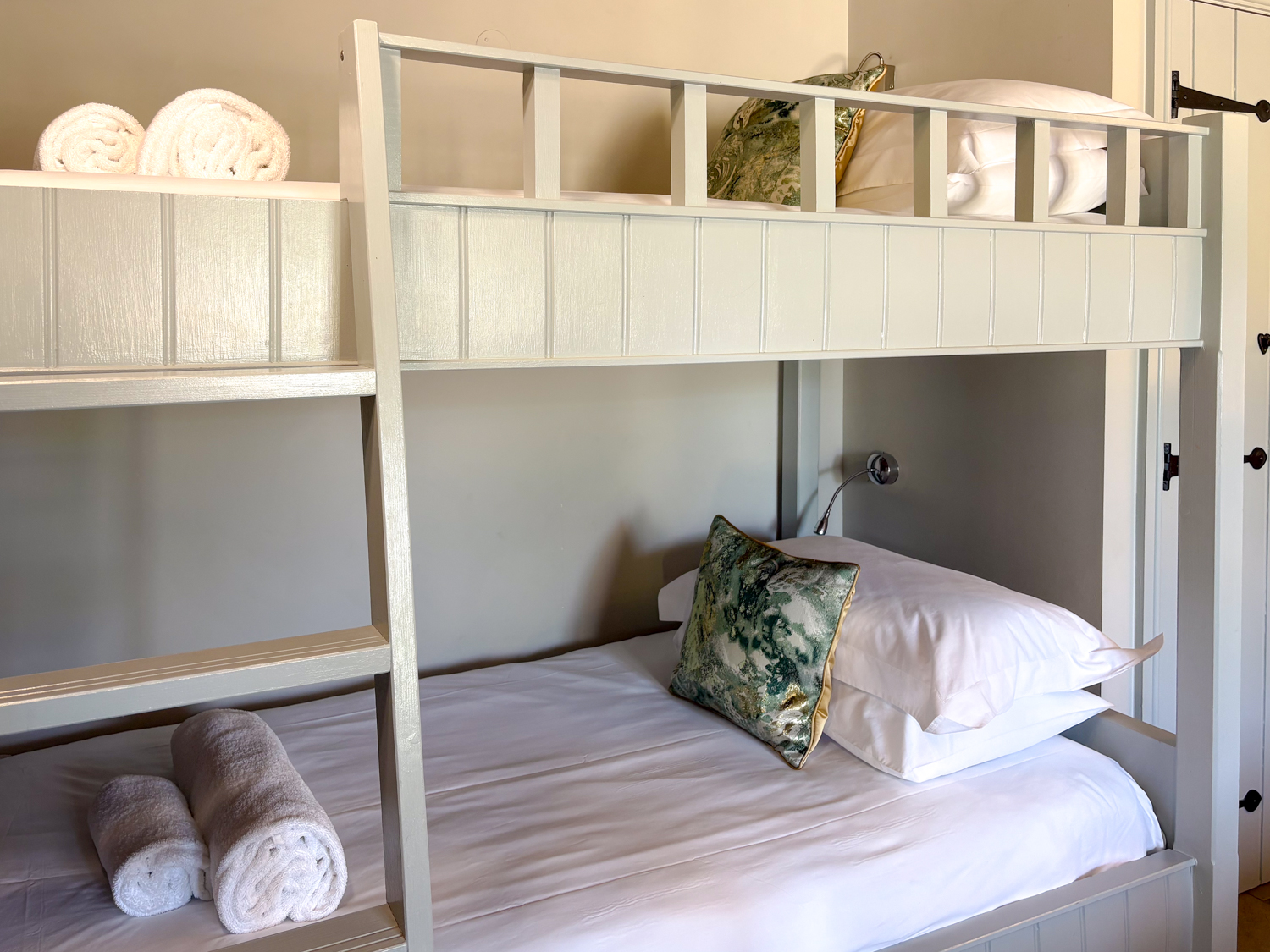 Bedroom 3: kids’ room with full-size bunks + superking/ twin beds, 32" TV, cot space