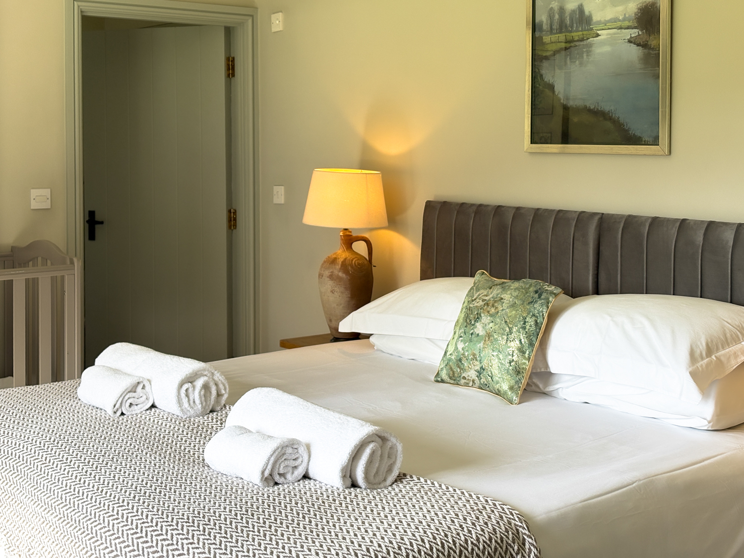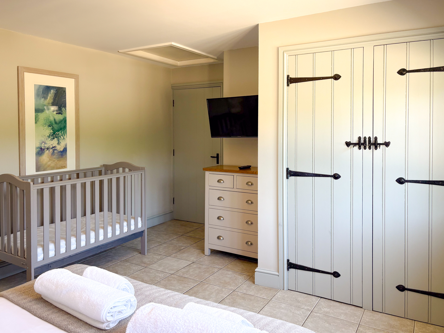 Bedroom 1: superking/ twin bed, 32" Smart TV, contemporary en-suite, space for a cot