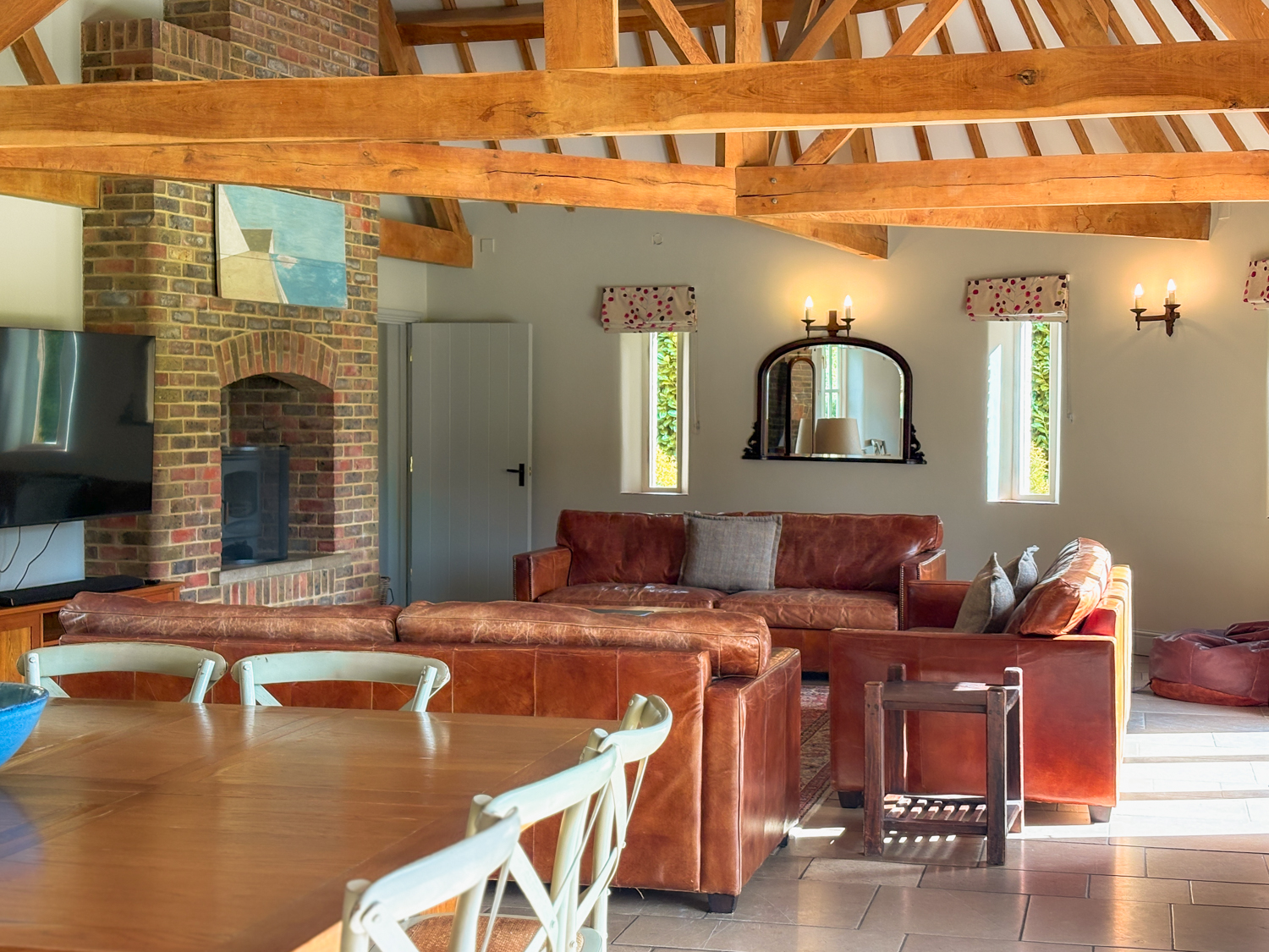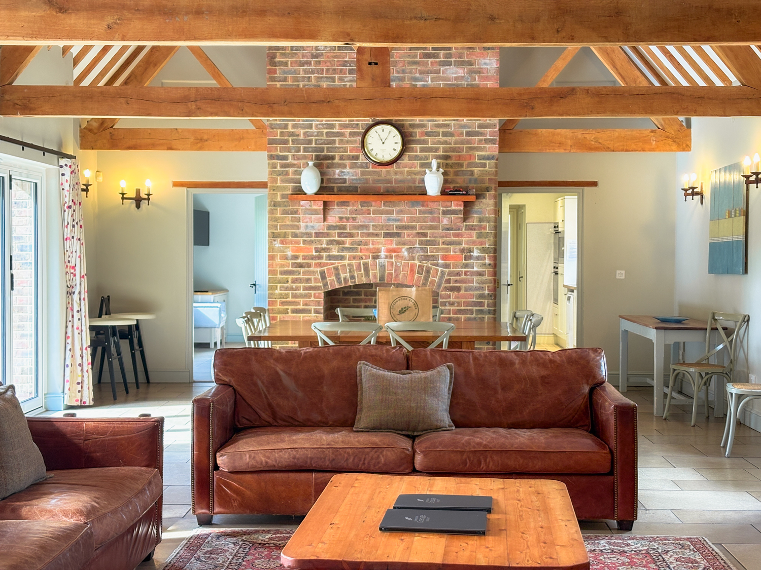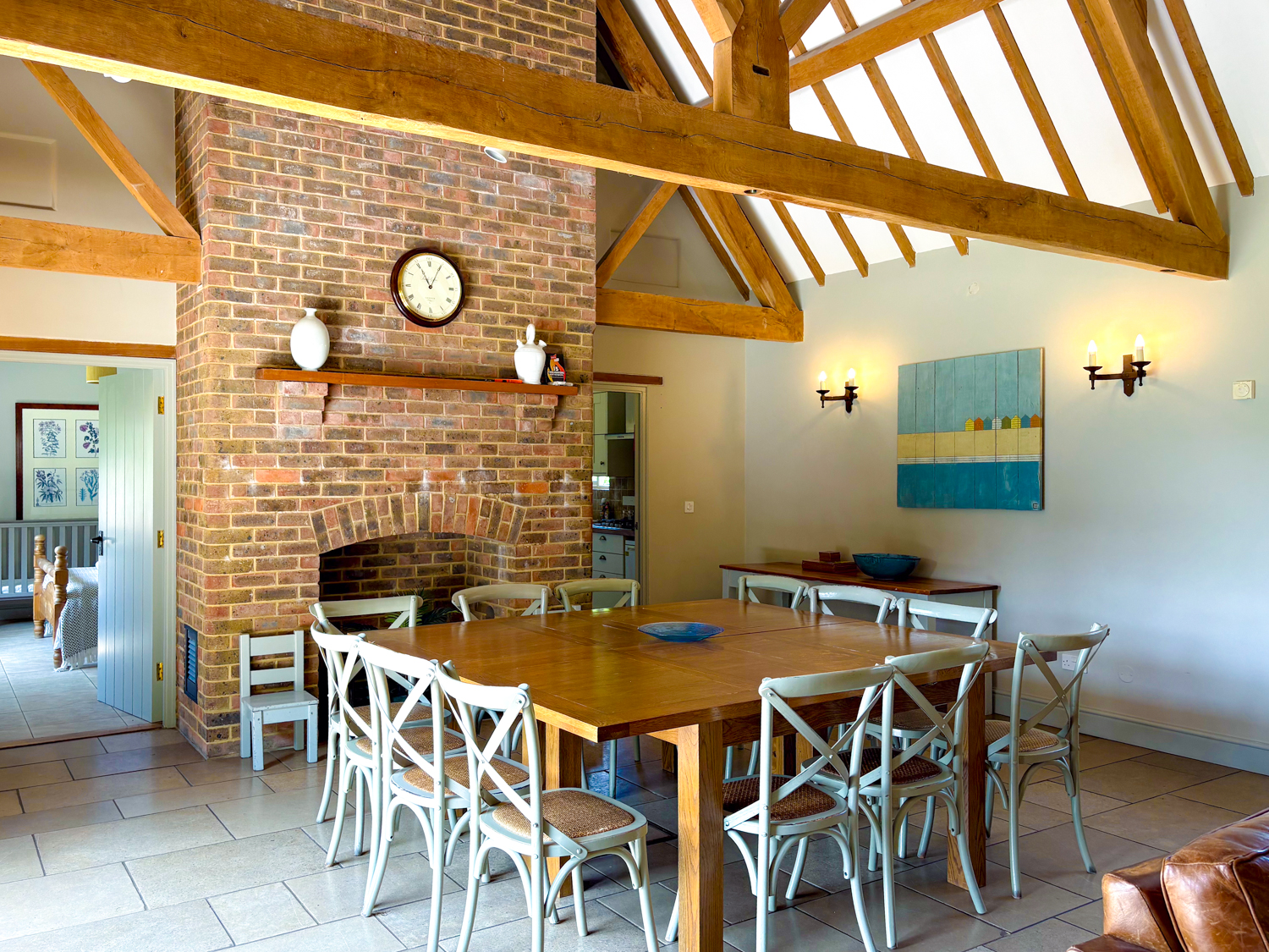 The huge open-plan sitting and dining area features exposed beams, underfloor heating, a wood-burning stove, and a 64" Smart TV. The dining table seats 12, ideal for group meals after exploring the Jurassic Coast or onsite facilities.