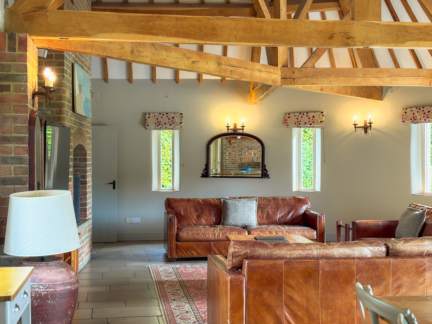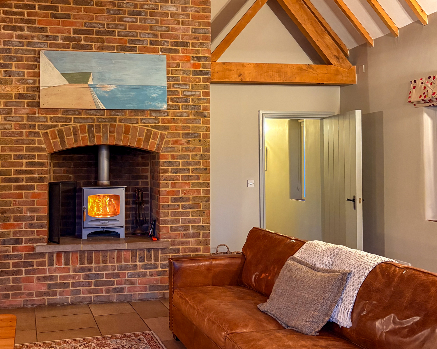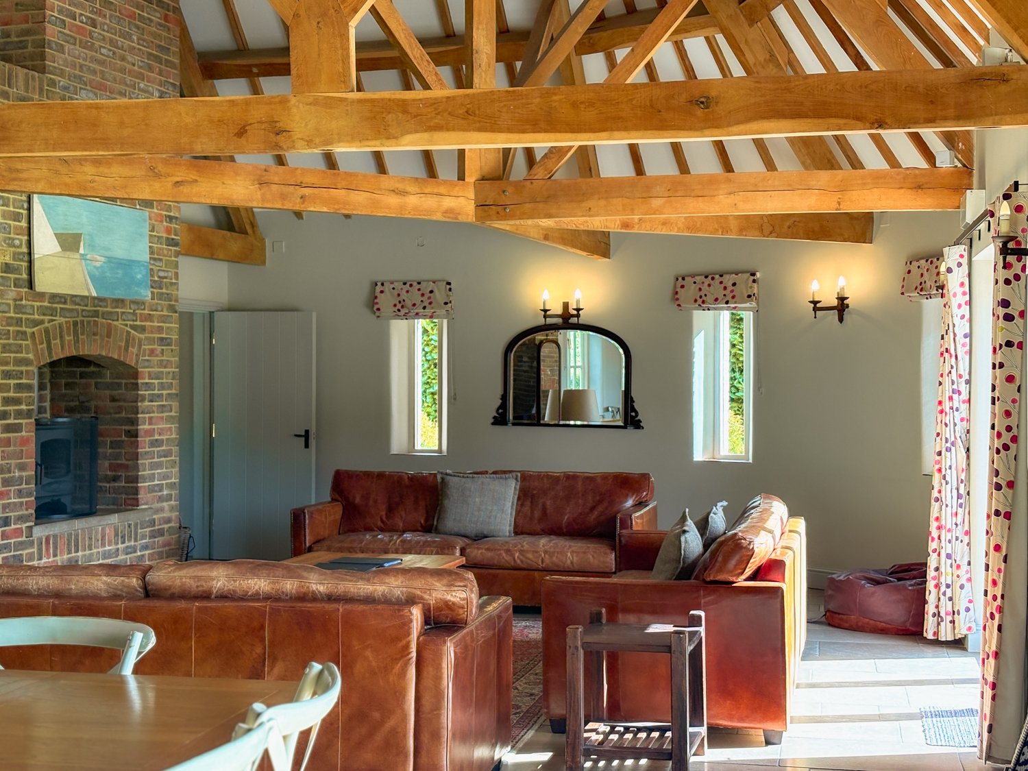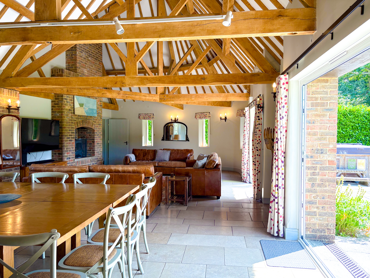 The huge open-plan sitting and dining area features exposed beams, underfloor heating, a wood-burning stove, and a 64" Smart TV. The dining table seats 12, ideal for group meals after exploring the Jurassic Coast or onsite facilities.