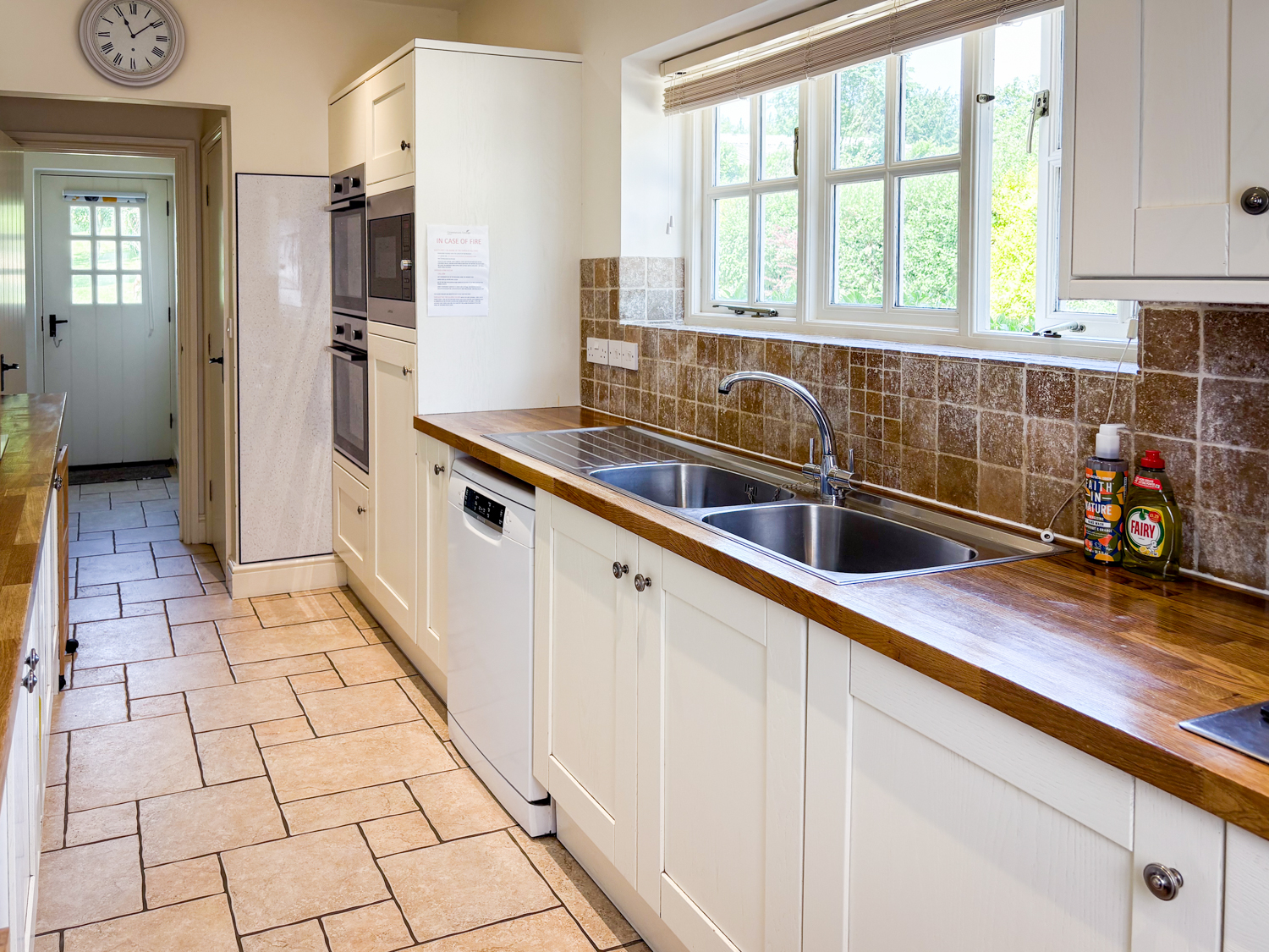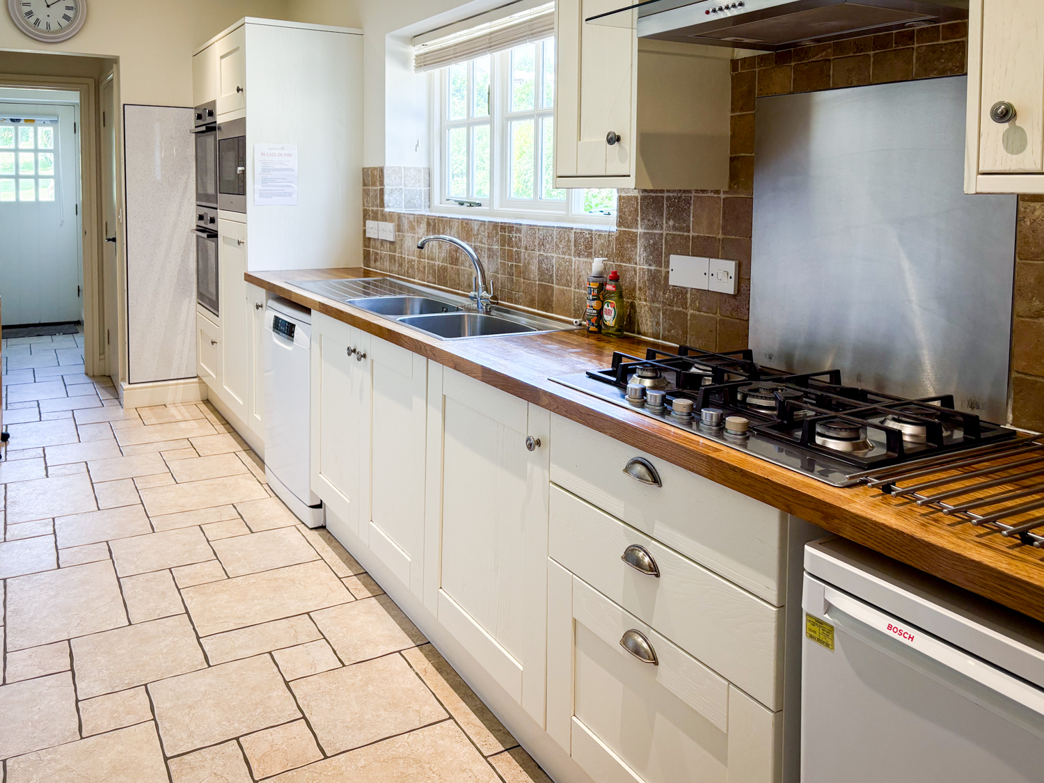The modern galley kitchen includes two ovens, gas hob, dishwasher, two fridges, freezer, washing machine, microwave, and a utility area with cloakroom WC.
