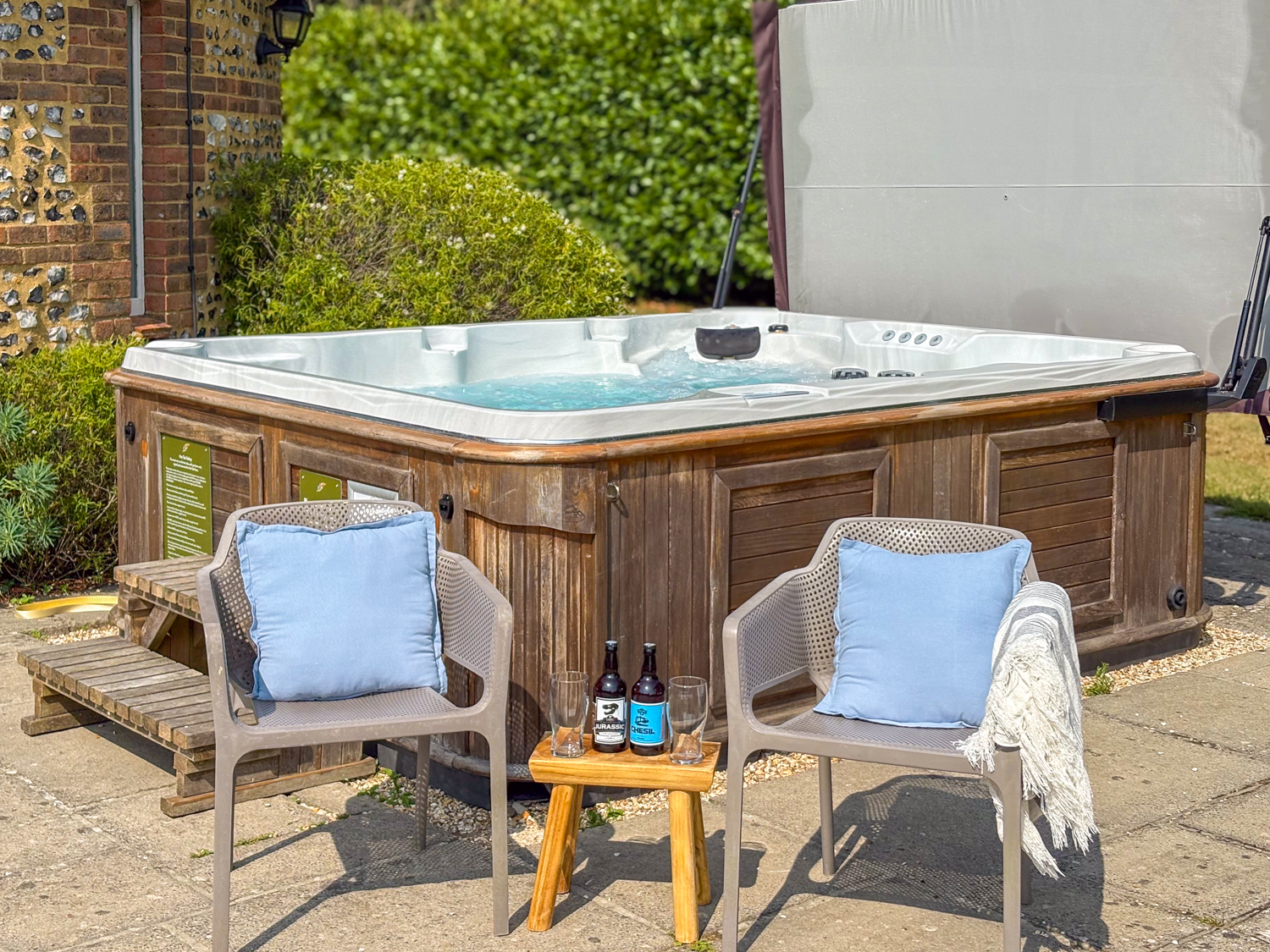 Two sets of Bi-Fold doors lead to a large private patio with Private XL Hot Tub, seating for 12, barbecue, and an enclosed lawn overlooking the lake, willow structures, wildlife areas, and beautiful countryside views. Guests can enjoy outdoor games, relaxing loungers, and peaceful surroundings.