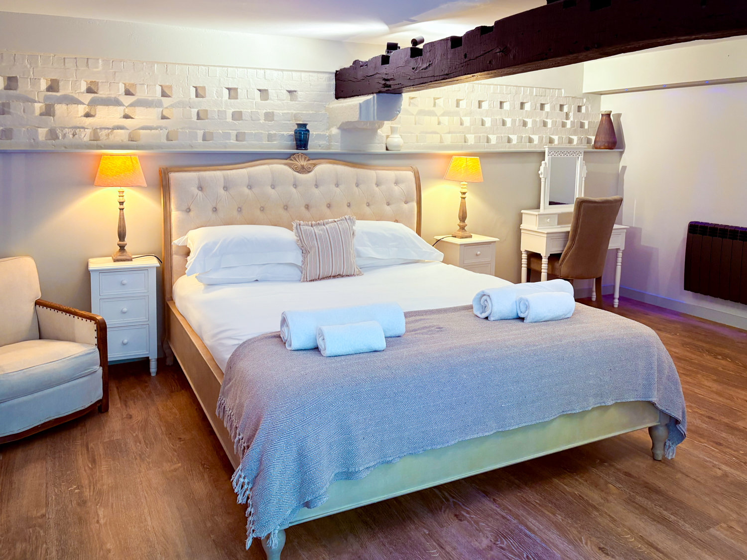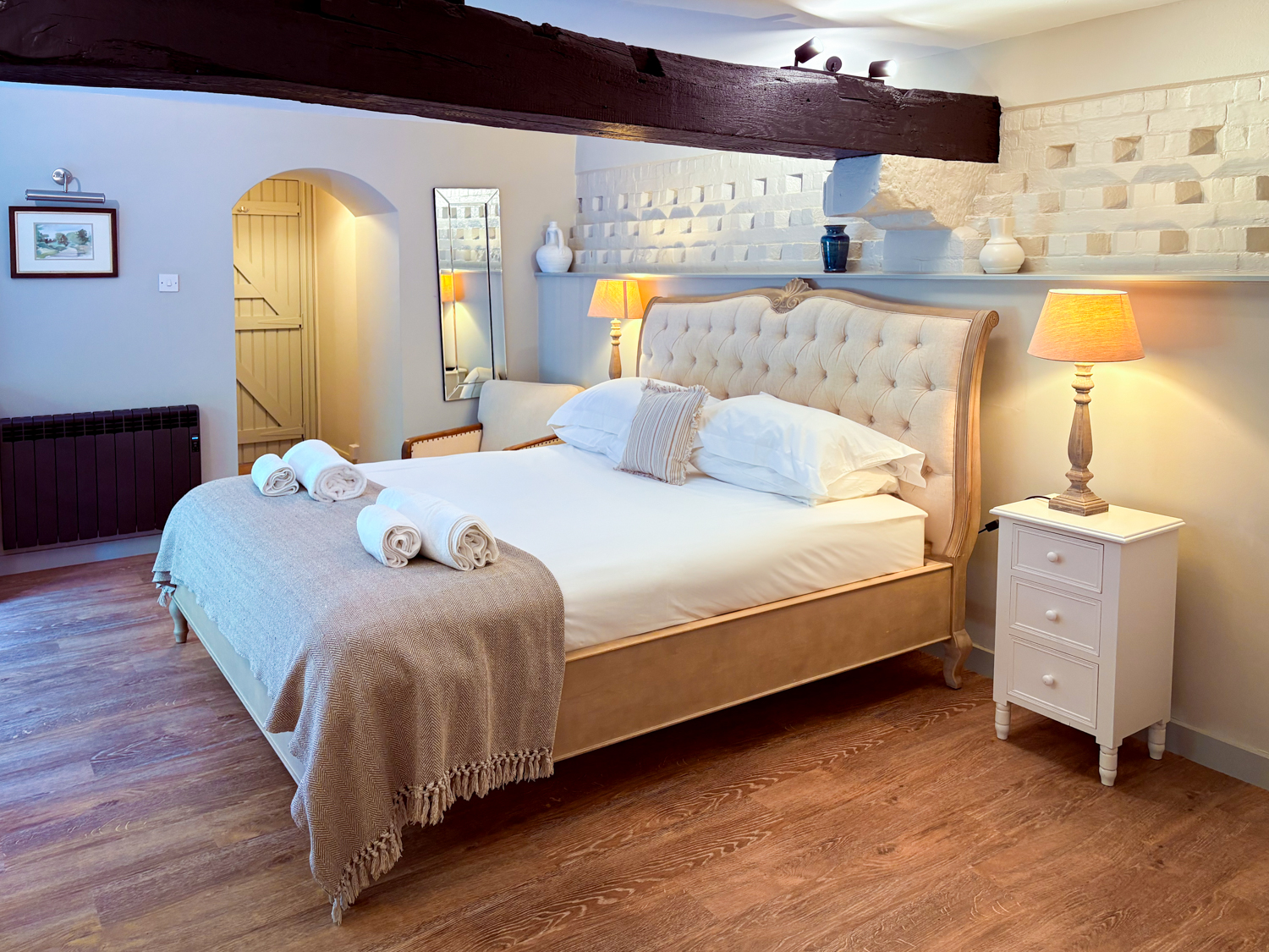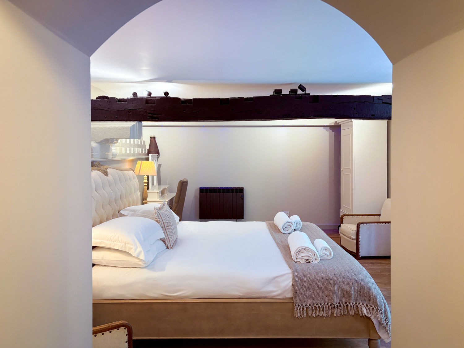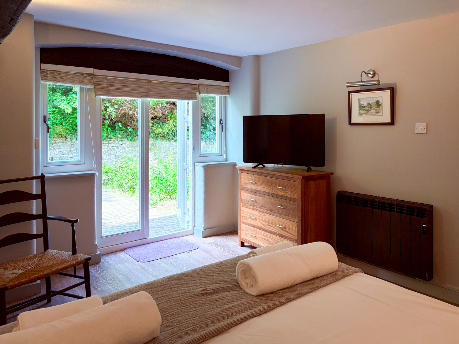 Master bedroom: super king-size bed, seating corner, modern fire, TV, and French doors to a private suntrap patio