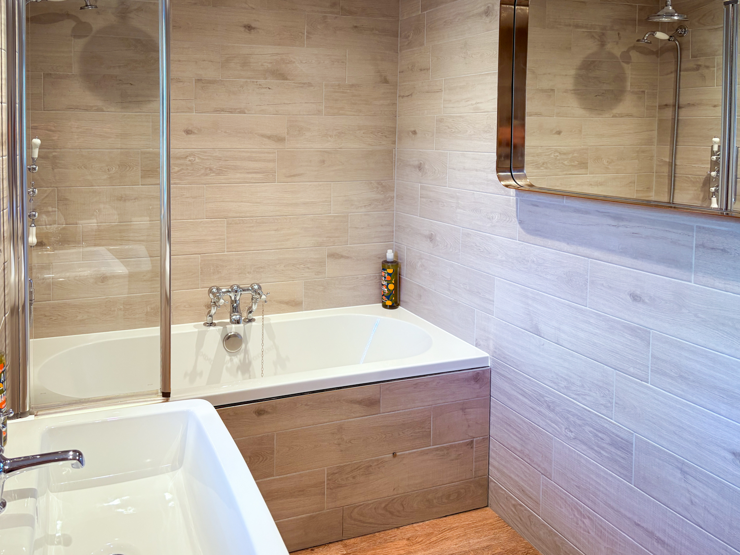 Modern bathroom with bath over shower