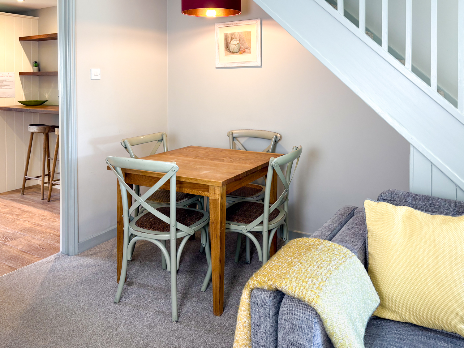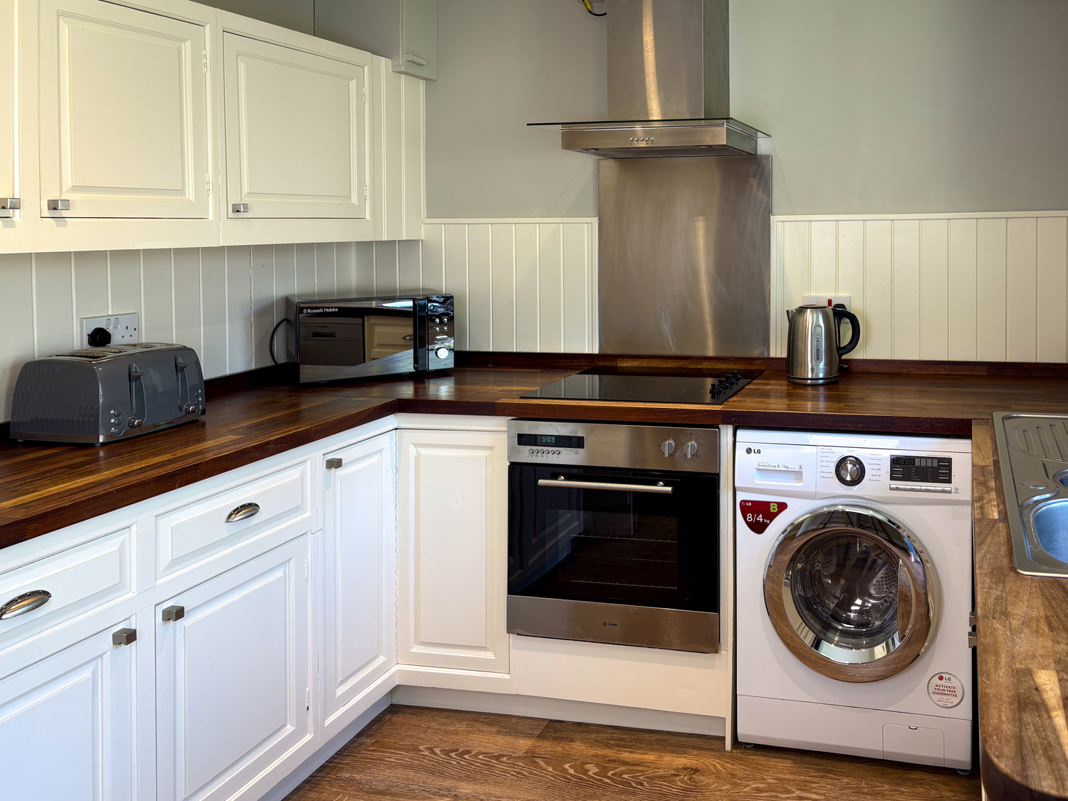 The bright, contemporary sitting room offers comfortable seating, a dining area, and a Smart TV, creating a relaxed space to unwind after a day out. The modern kitchen is fully equipped with oven, hob, dishwasher, microwave, large fridge-freezer, washer-dryer, and a breakfast bar for casual dining.