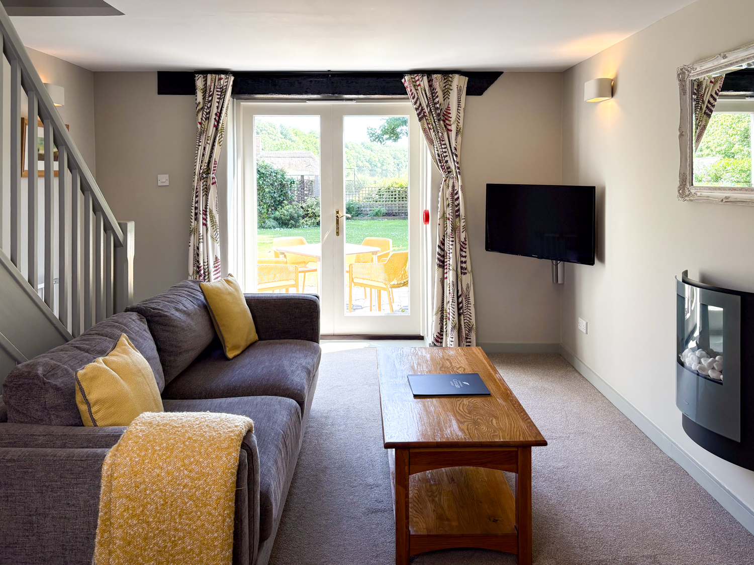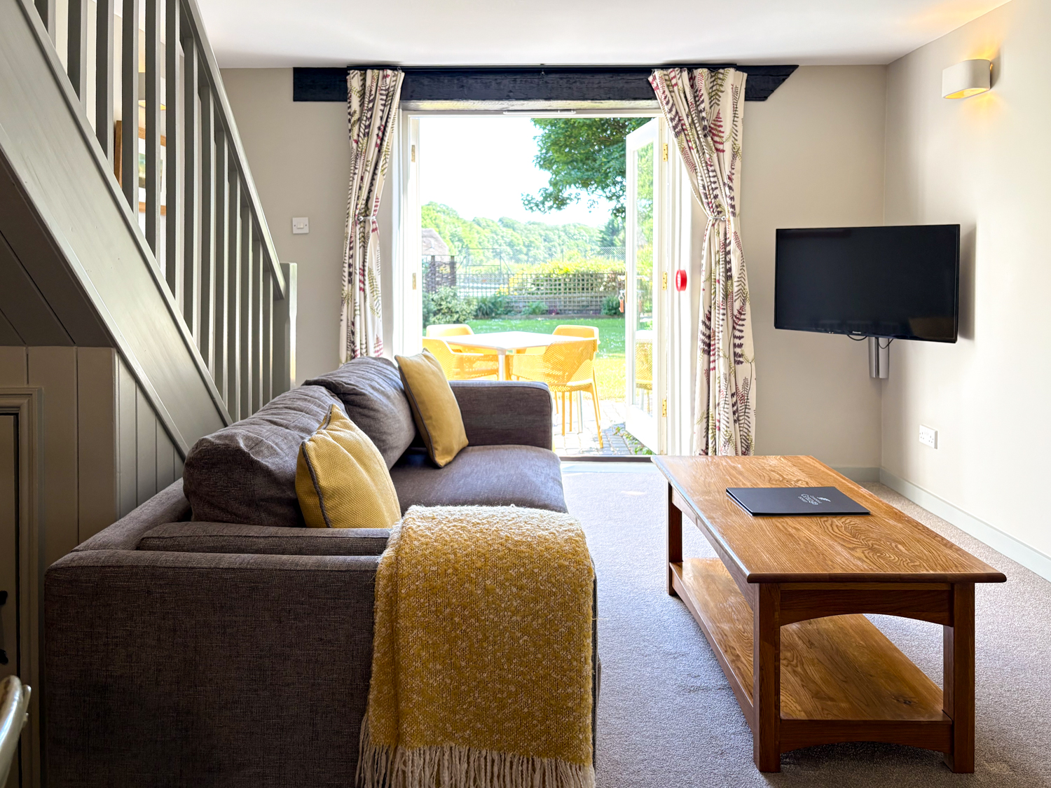 The French doors open onto a private patio area with dining table and chairs overlooking the Lawn. Guests enjoy full access to Greenwood Grange’s communal gardens, hot tubs, and outdoor leisure areas (See Estate Map). Perfect for a relaxing break in the Dorset Countryside.