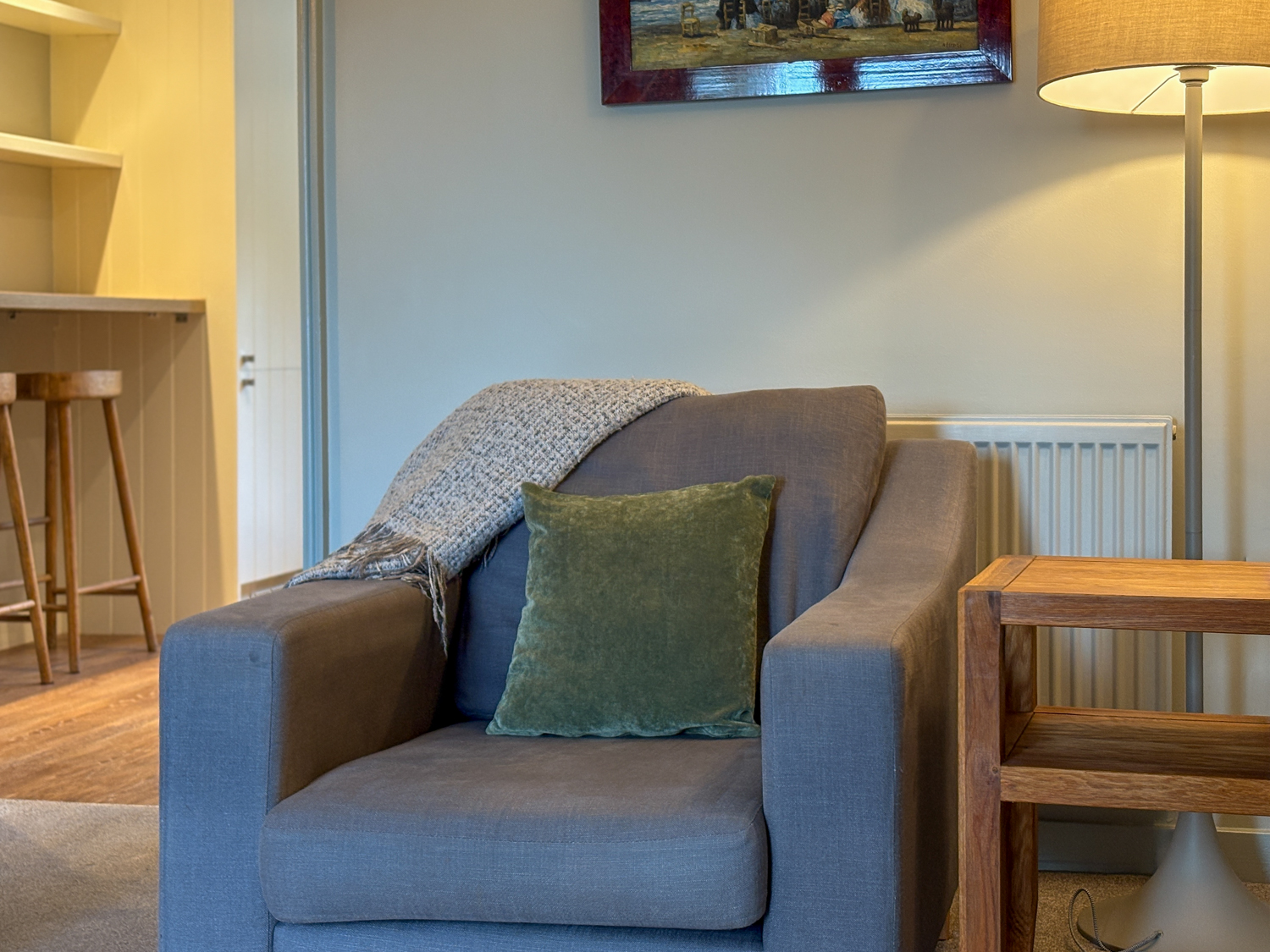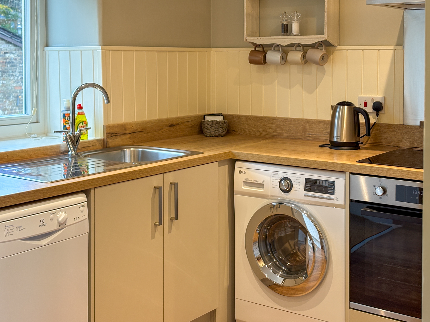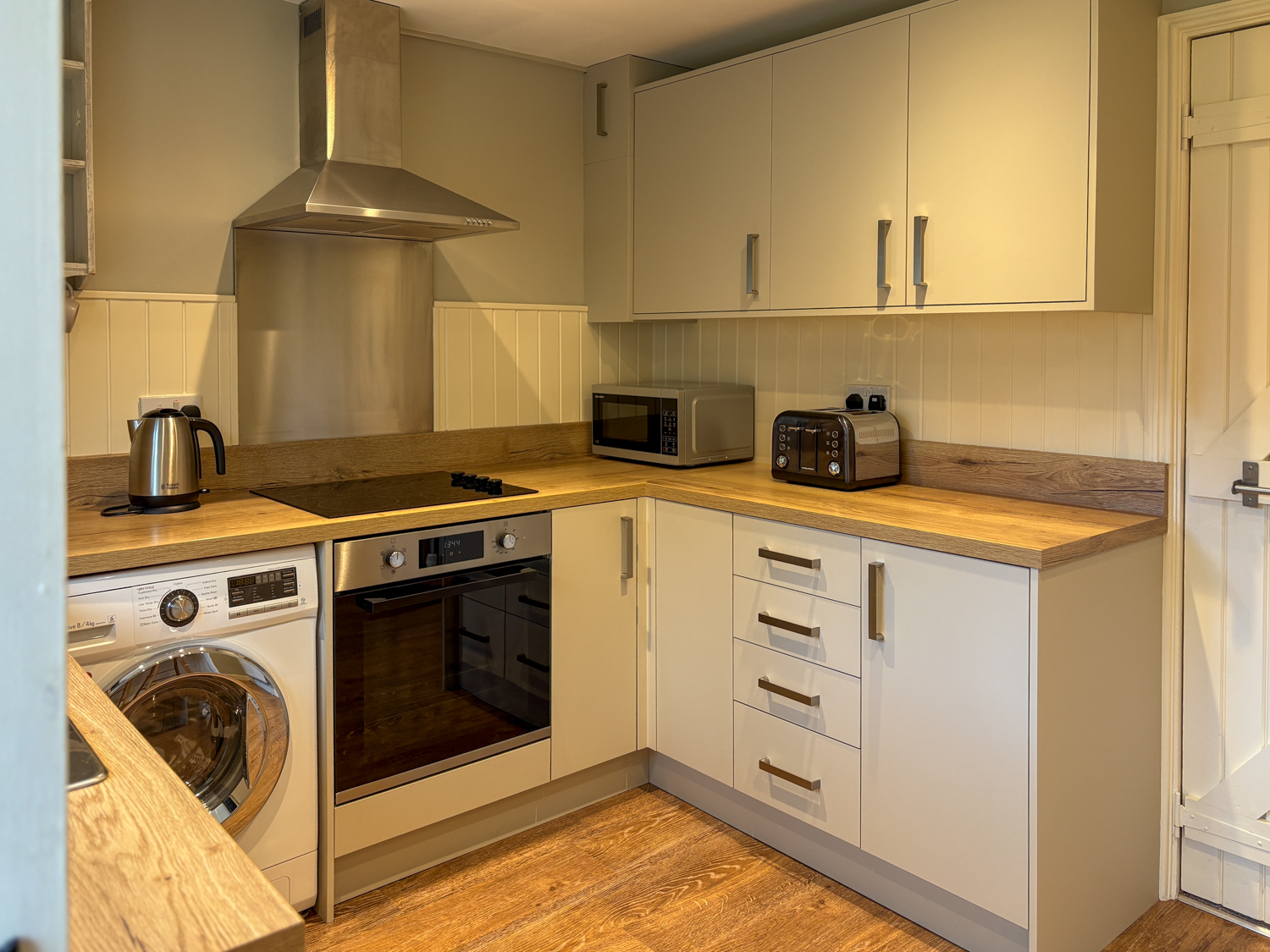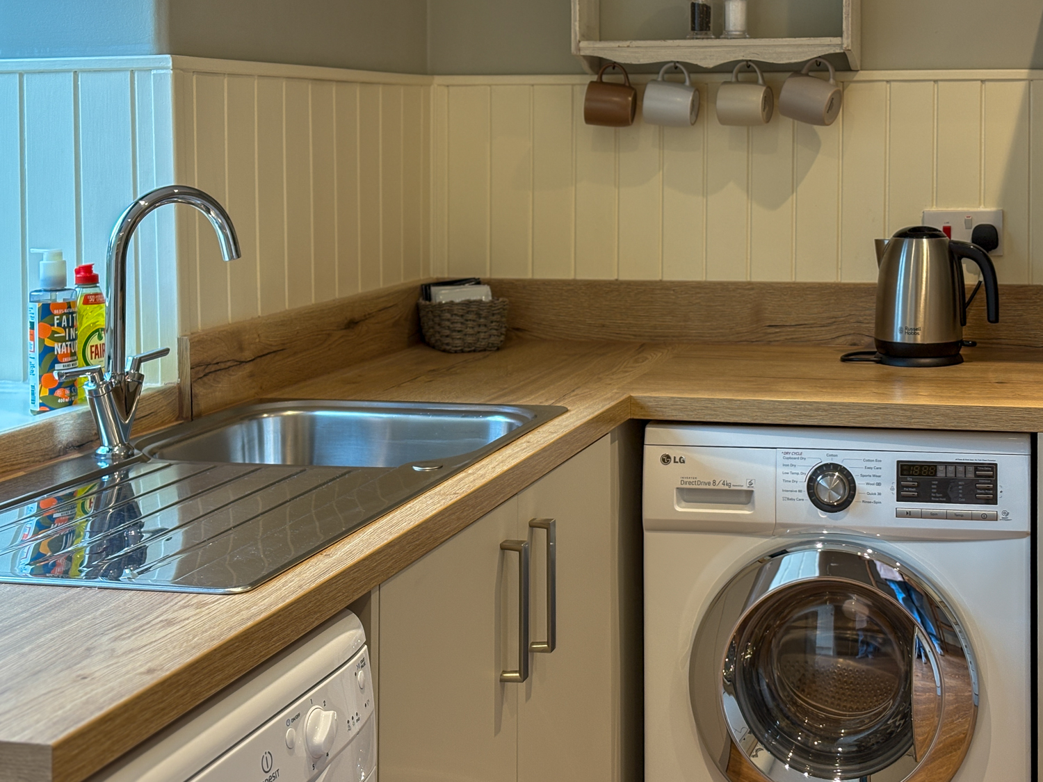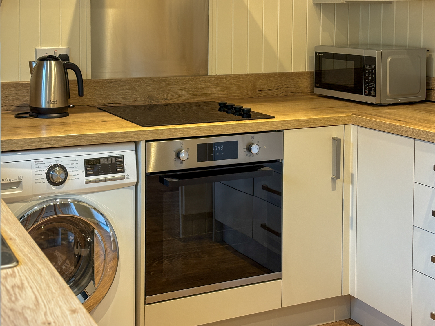 The bright, contemporary sitting room offers comfortable seating, a dining area, and a Smart TV, creating a relaxed space to unwind after a day out. The modern kitchen is fully equipped with oven, hob, dishwasher, microwave, large fridge-freezer, washer-dryer, and a breakfast bar for casual dining.