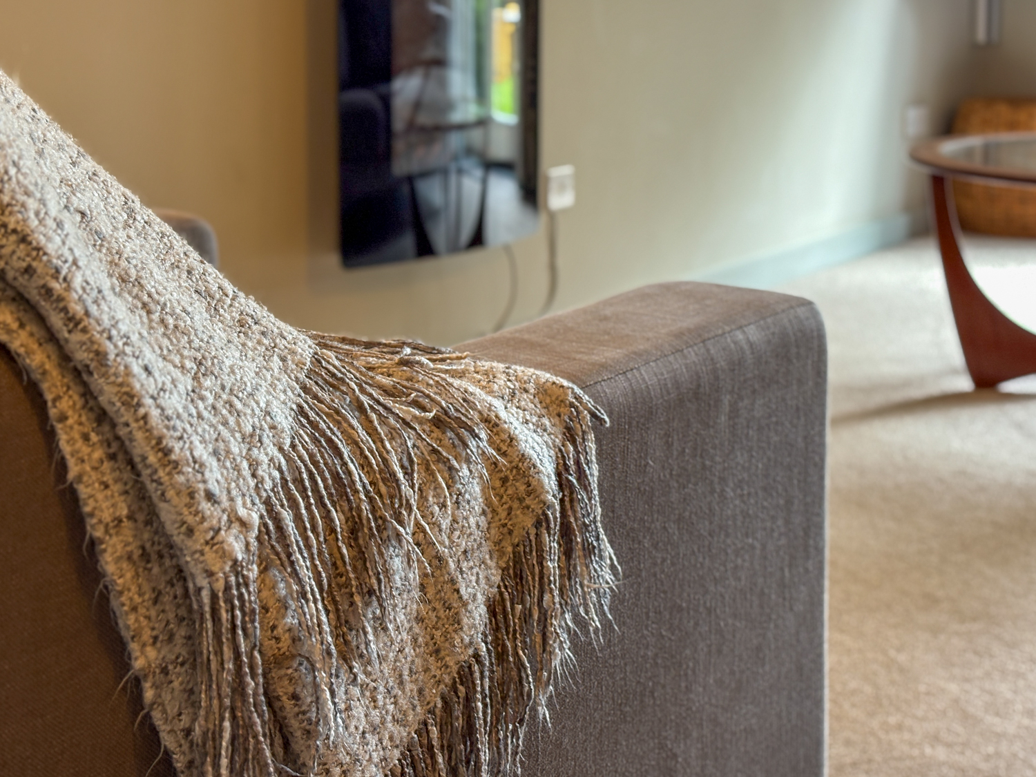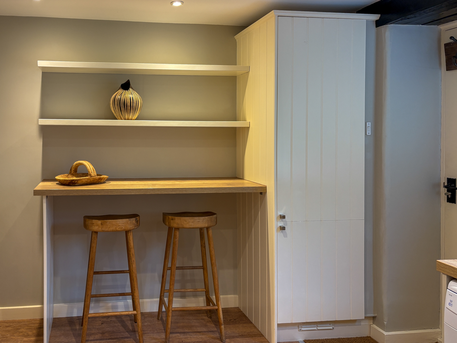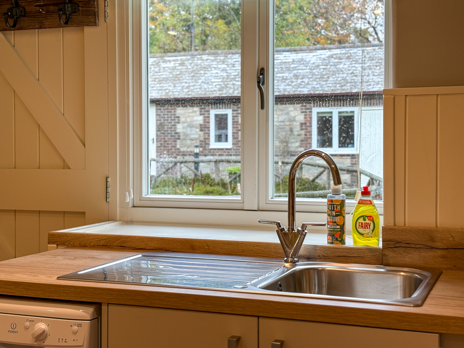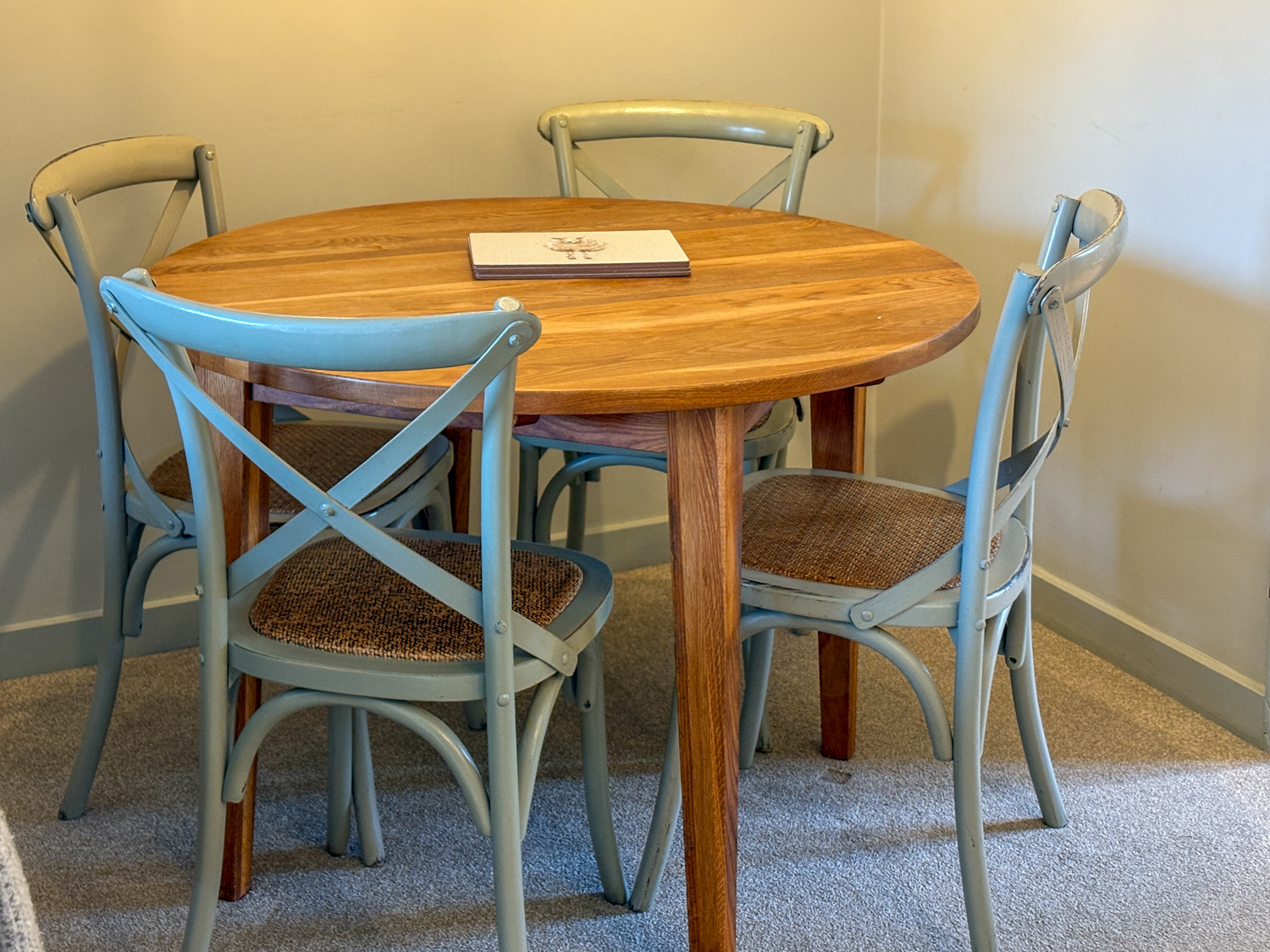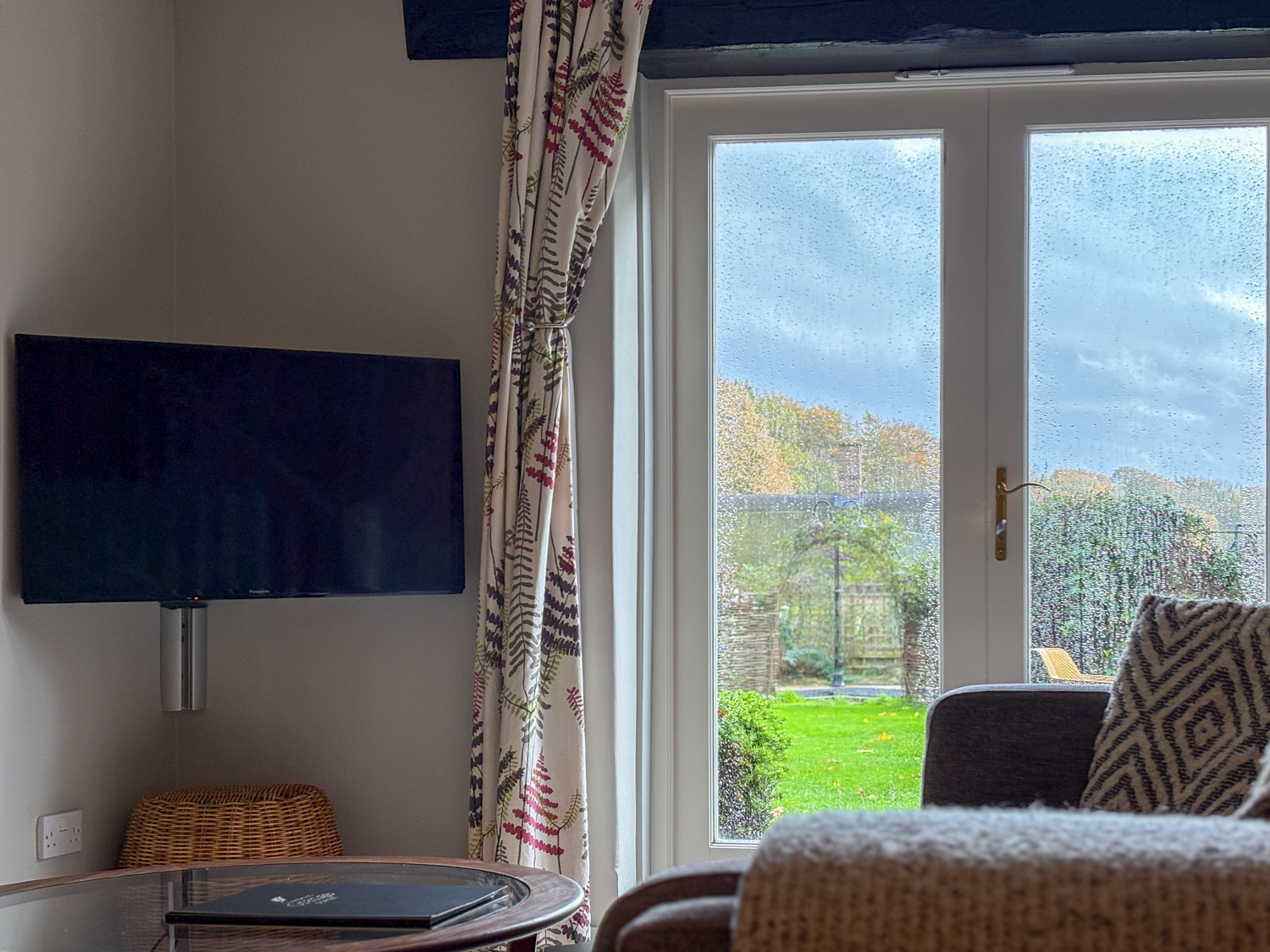 The French doors open onto a private patio area with dining table and chairs overlooking the Lawn. Guests enjoy full access to Greenwood Grange’s communal gardens, hot tubs, and outdoor leisure areas (See Estate Map). Perfect for a relaxing break in the Dorset Countryside.