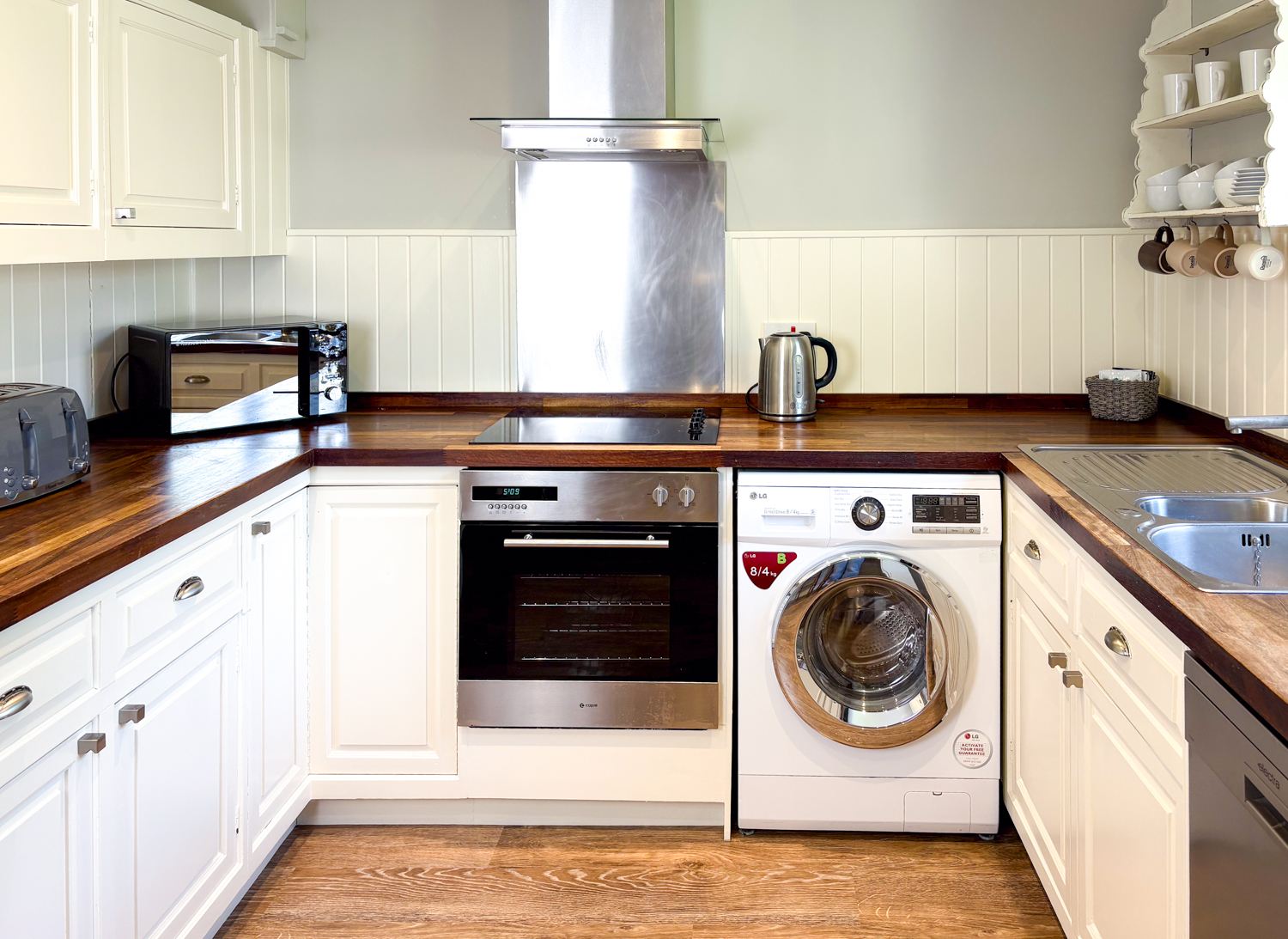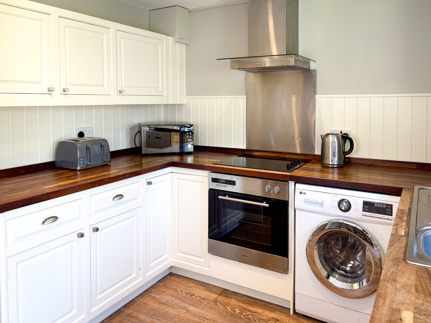 The bright, contemporary sitting room offers comfortable seating, a dining area, and a Smart TV, creating a relaxed space to unwind after a day out. The modern kitchen is fully equipped with oven, hob, dishwasher, microwave, large fridge-freezer, washer-dryer, and a breakfast bar for casual dining.