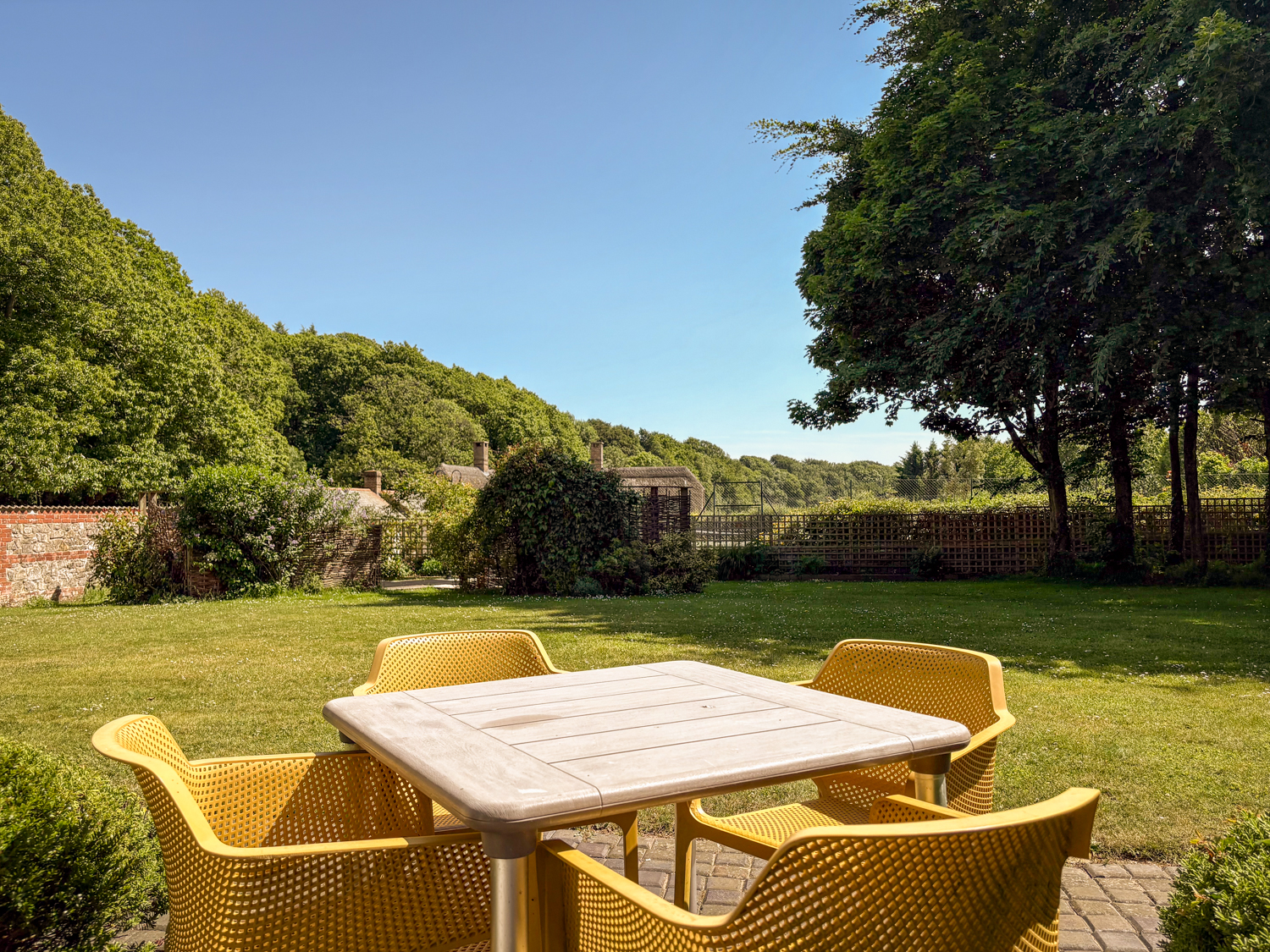 The French doors open onto a private patio area with dining table and chairs overlooking the Lawn. Guests enjoy full access to Greenwood Grange’s communal gardens, hot tubs, and outdoor leisure areas (See Estate Map). Perfect for a relaxing break in the Dorset Countryside.