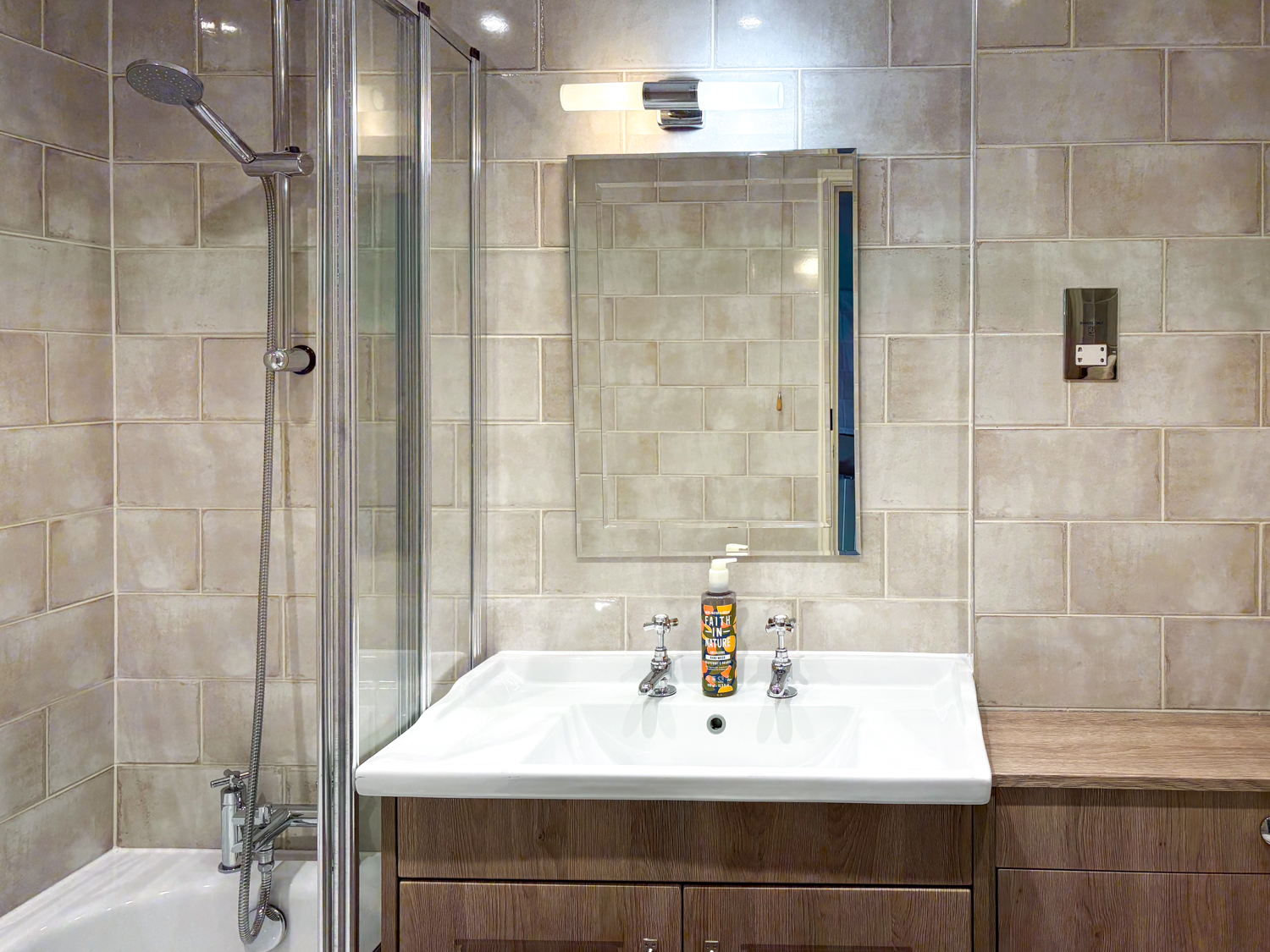 The modern bathroom includes a shower over bath, basin, and WC.