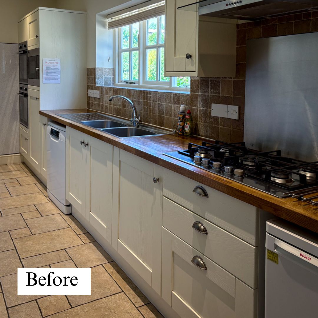 Nick and Jacqui have been hard at work removing the cupboard doors, sanding them down and a lot of painting. My dad, Rich, installed new up and down-lighting in the kitchen too, to bring a modern touch.