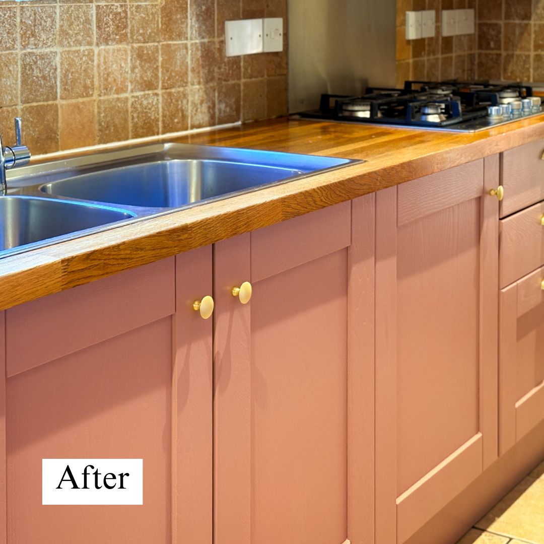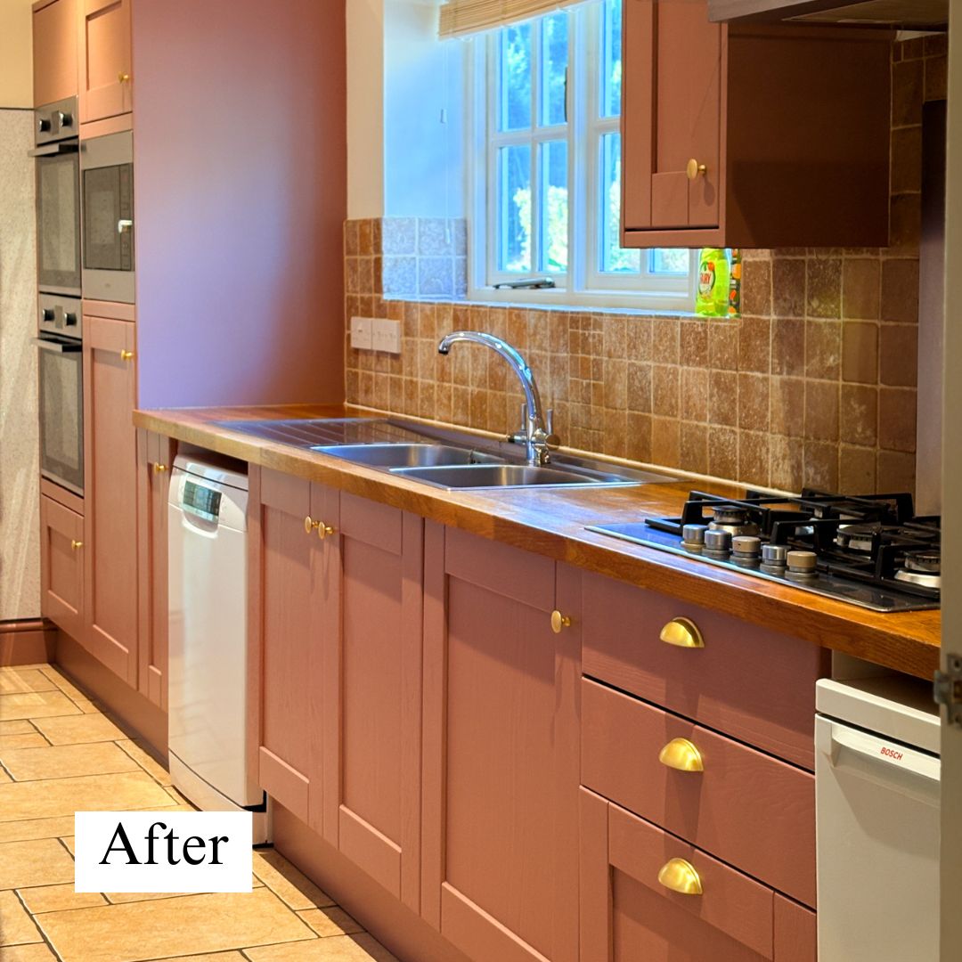 The first kitchen that we started was Henchard. Previously all cream, with cream walls and skirting boards, we decided a warm, modern colour would suit this cottage well. The colour of choice was Farrow & Ball Sulking Room Pink. We loved the dusky, iconic shade of pink, but also wanted to support a fellow Dorset brand. F&B paint is still made right here in Dorset.