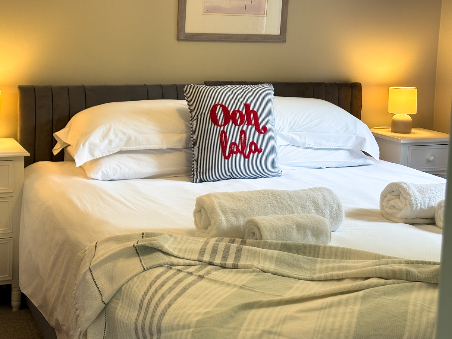 The spacious bedroom features a super king-size bed (convertible to twins) and ample storage. The en-suite bathroom includes a shower over the bath, basin, and WC, ideal for a relaxing stay in Dorset.