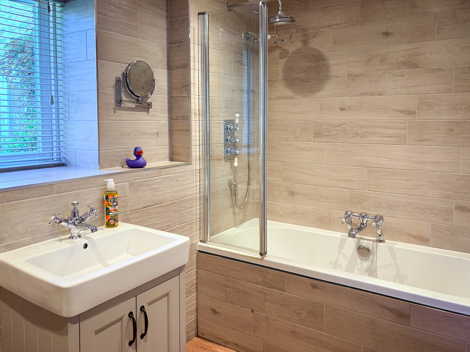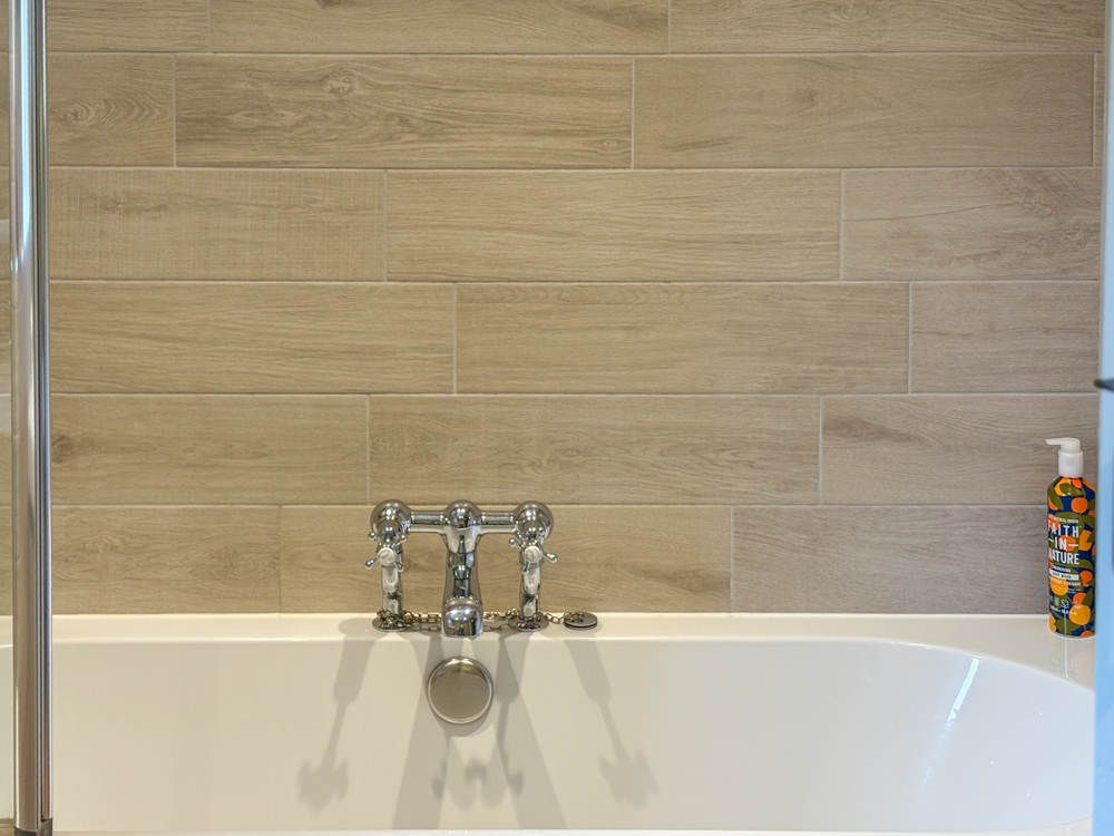 Modern bathroom with bath over shower