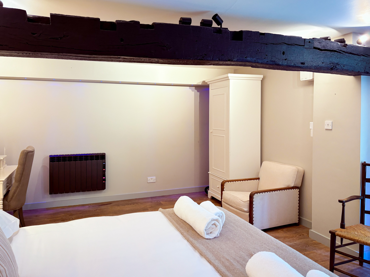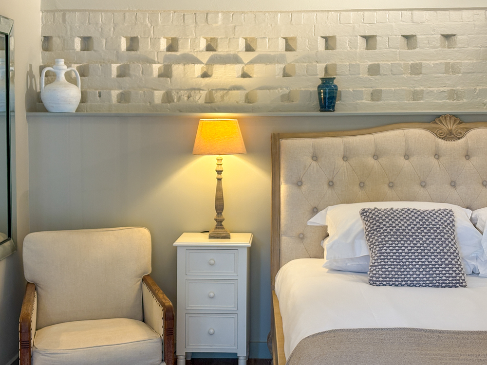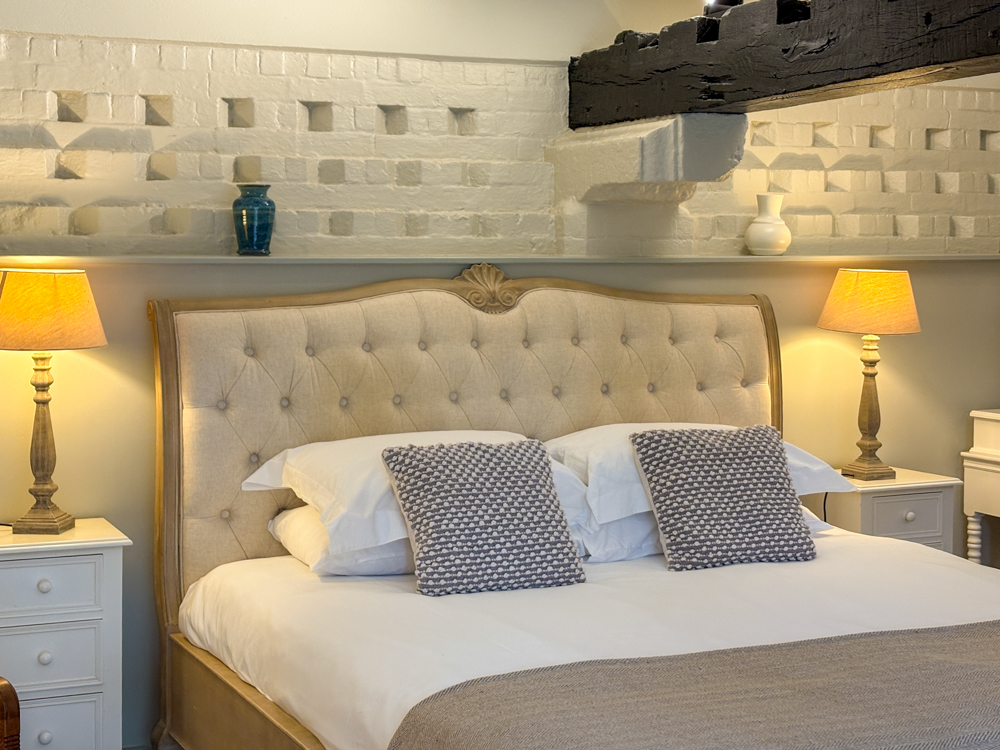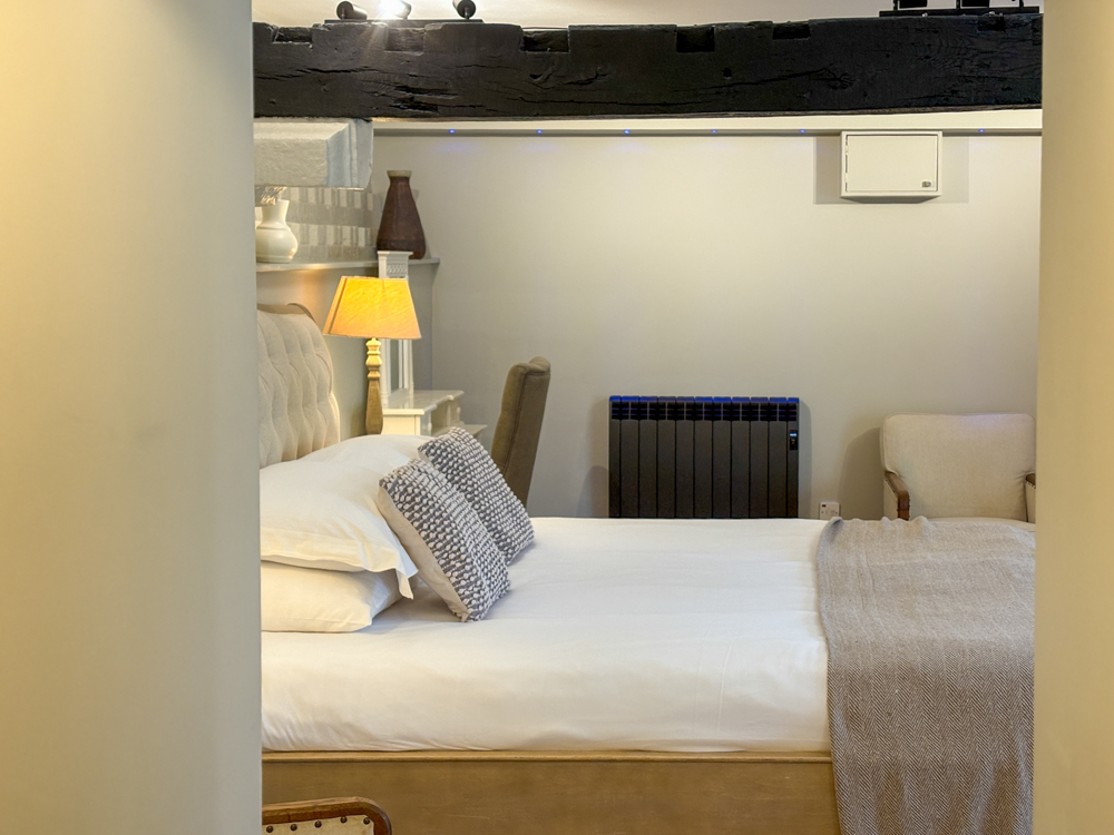 Master bedroom: super king-size bed, seating corner, modern fire, TV, and French doors to a private suntrap patio